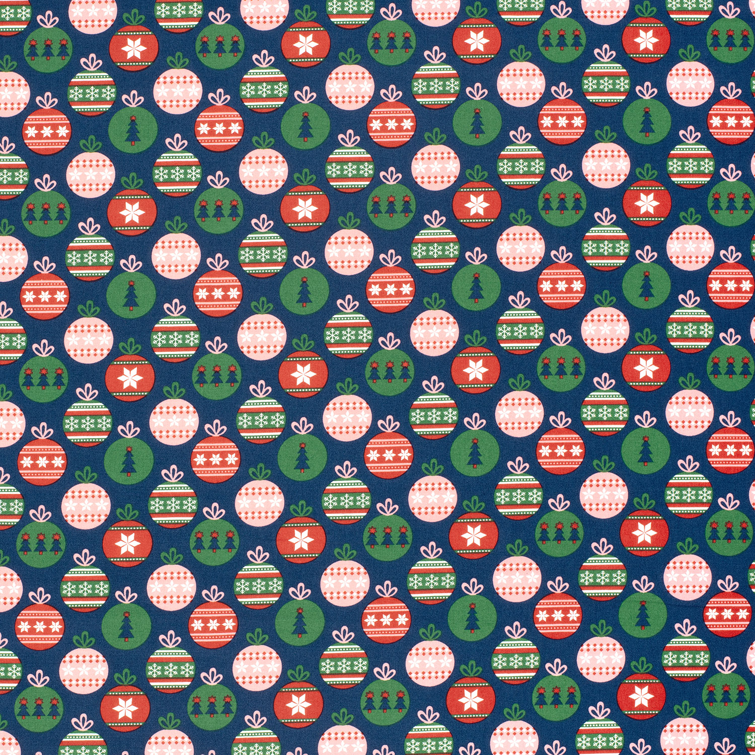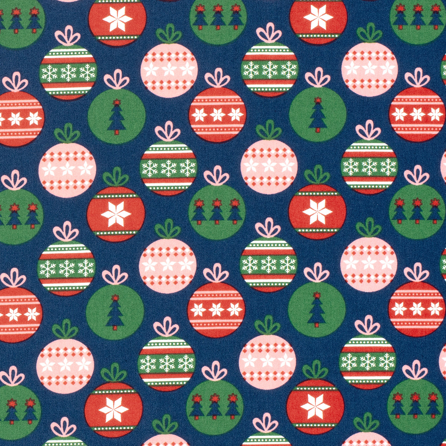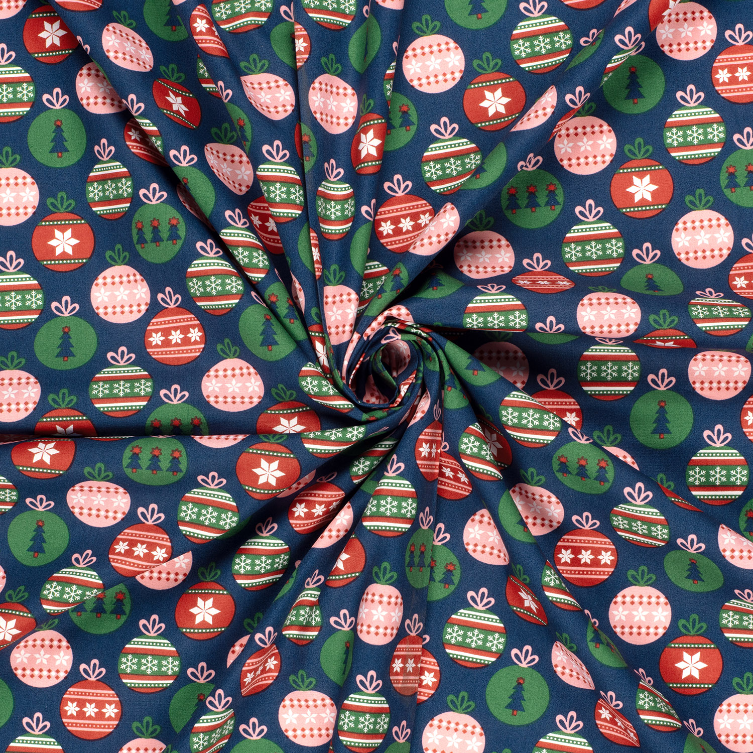 Ce tissu festif apporte la magie de Noël directement à votre table de couture : Sur un fond bleu foncé flottent des boules de Noël soigneusement dessinées de différentes formes et tailles. De fins ornements, des motifs délicats et de petites étoiles donnent aux boules un aspect élégant, presque nostalgique – comme des pièces préférées sélectionnées à la main sur le sapin de Noël.