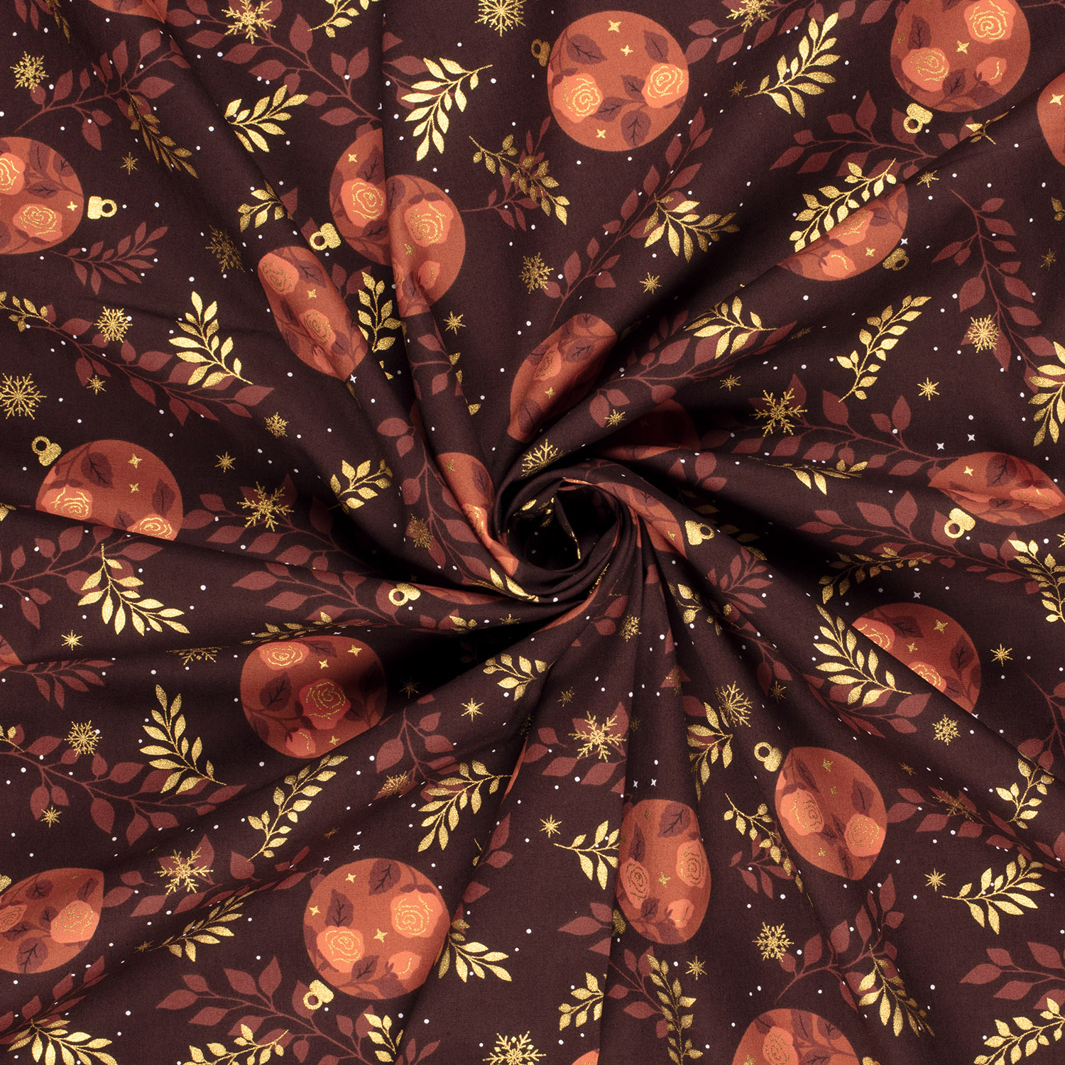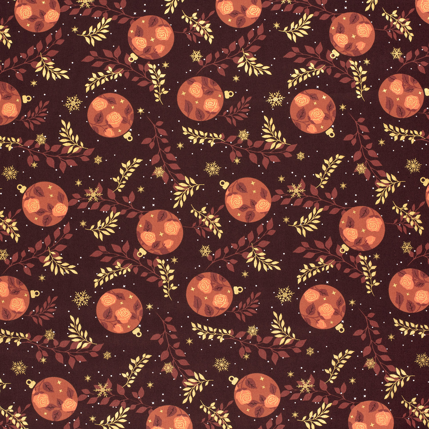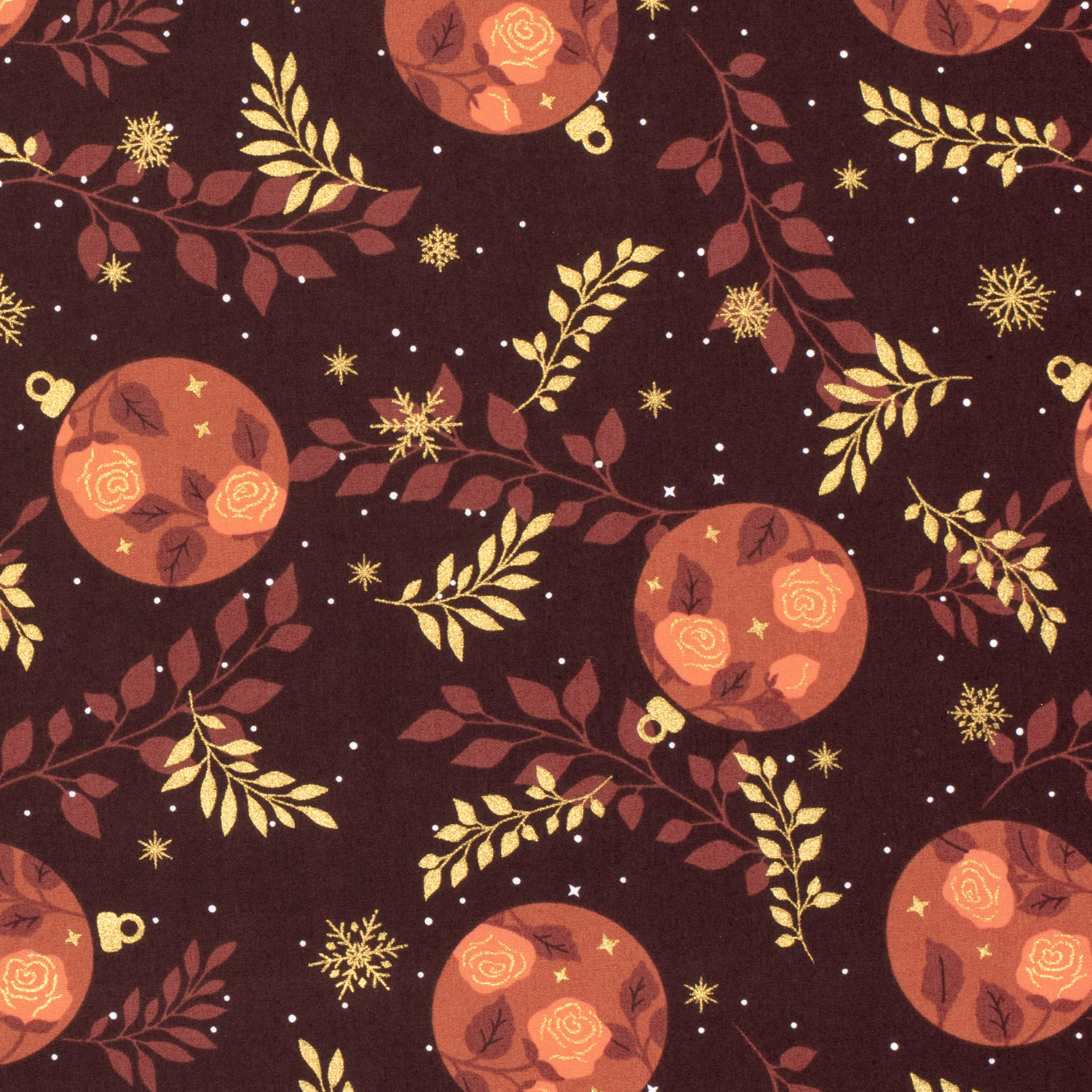 Popeline de coton – Boules de Noël et branches Bordeaux doré