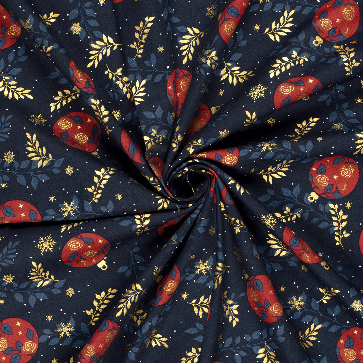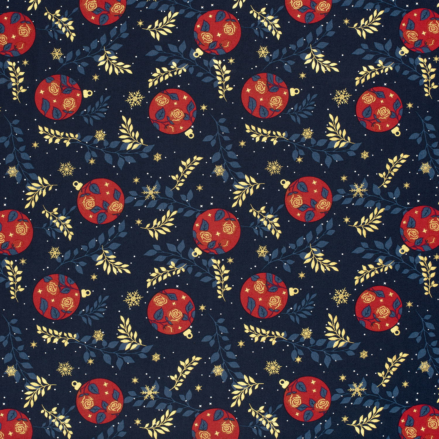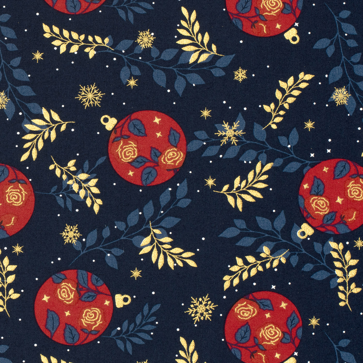 Un tissu de Noël élégant qui associe une ambiance festive à une touche de luxe : sur un fond bleu marine profond, des boules de Noël finement détaillées brillent d'un ton doré noble. De délicates branches et de fins ornements entourent les boules, conférant au design une allure stylée, presque féerique.