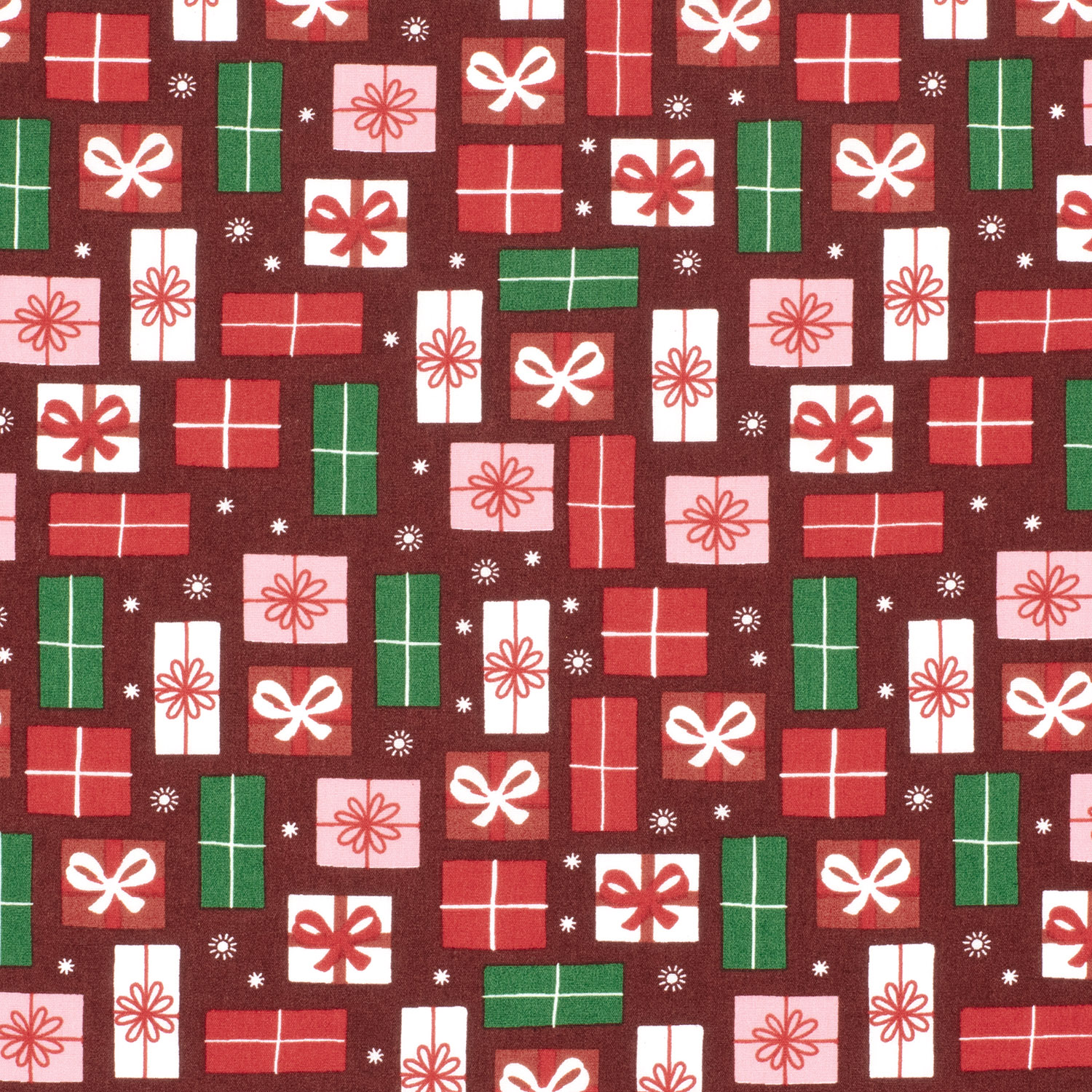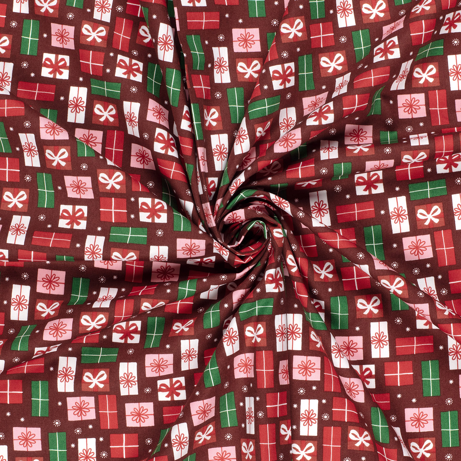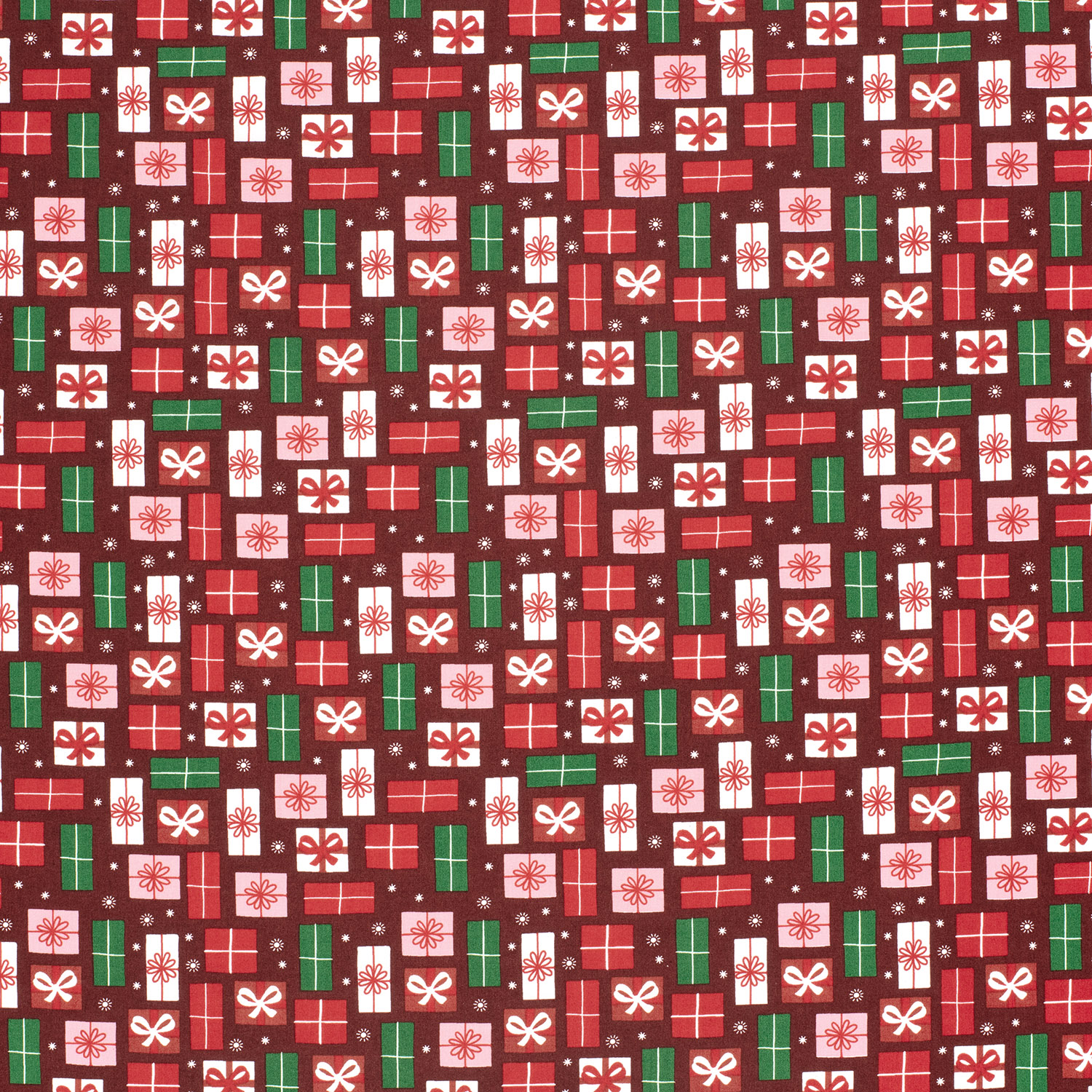 Ambiance festive à coudre : Ce magnifique tissu en coton d'un bordeaux élégant est parsemé de paquets cadeaux délicatement dessinés. De délicates boîtes en blanc et rose clair, parfois ornées de petits pois, s'alignent comme de petites surprises sous le sapin de Noël. Des contours fins et des rubans dans des tons dorés chauds apportent au design un éclat discret et élégant – parfait pour ceux qui aiment la fête sans le kitsch.
