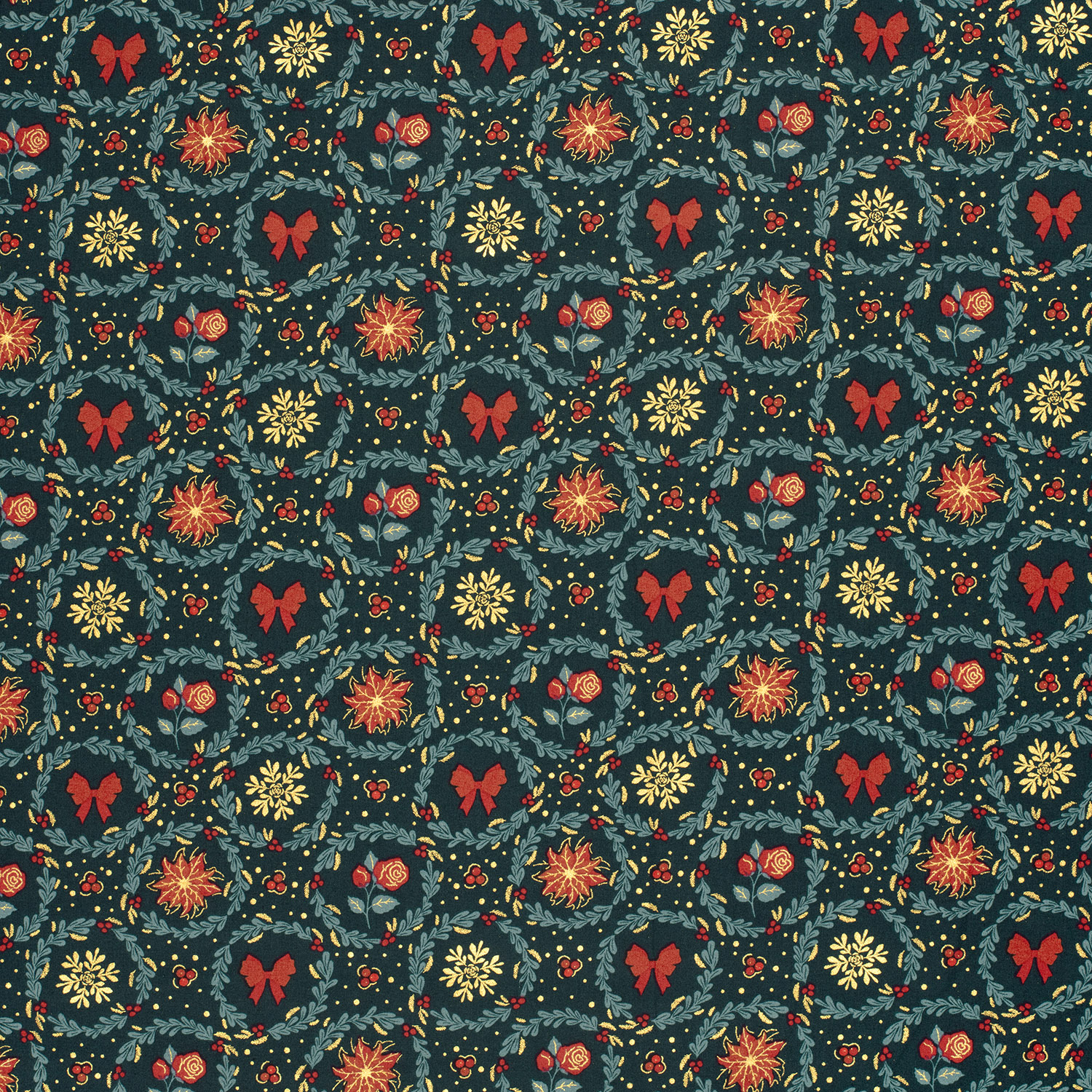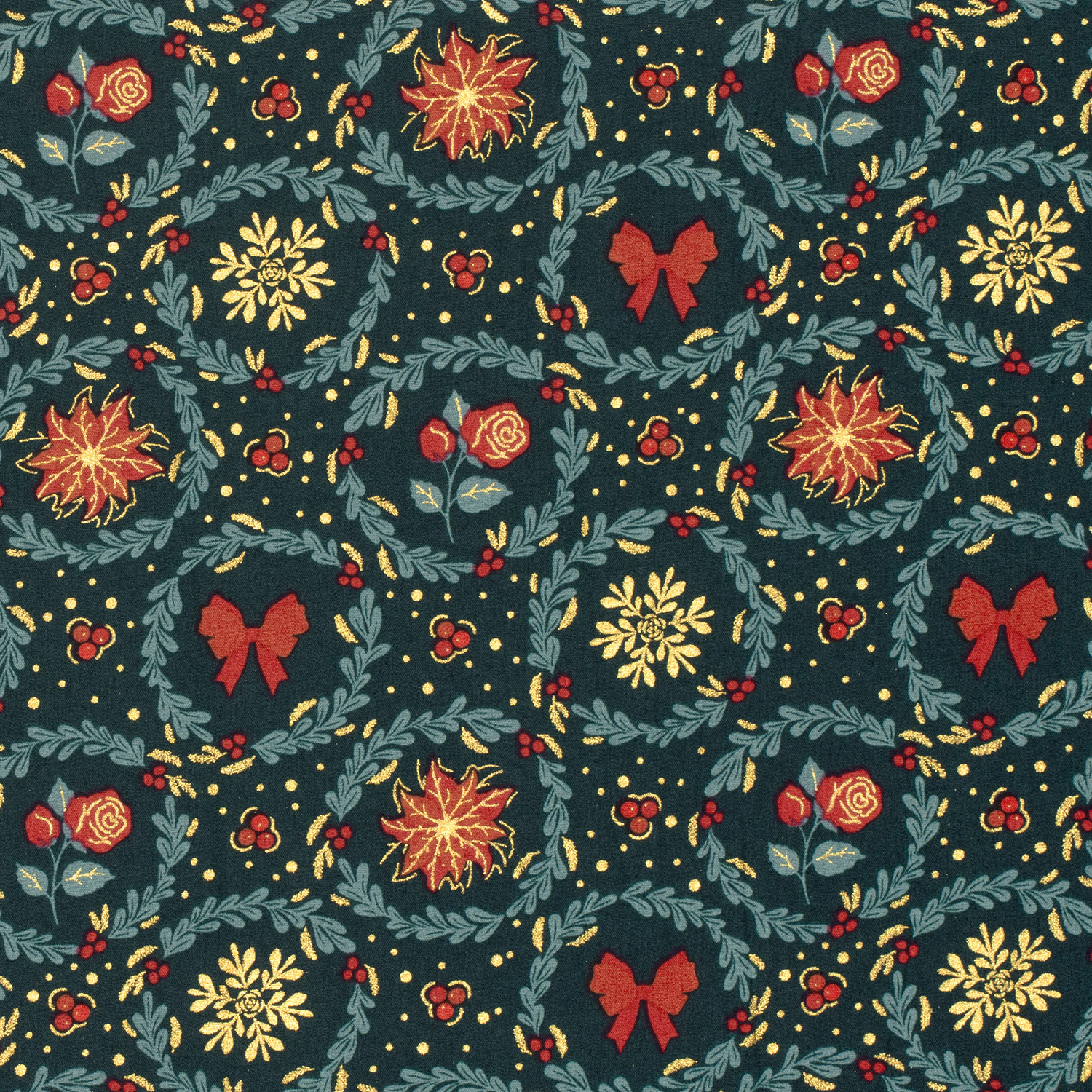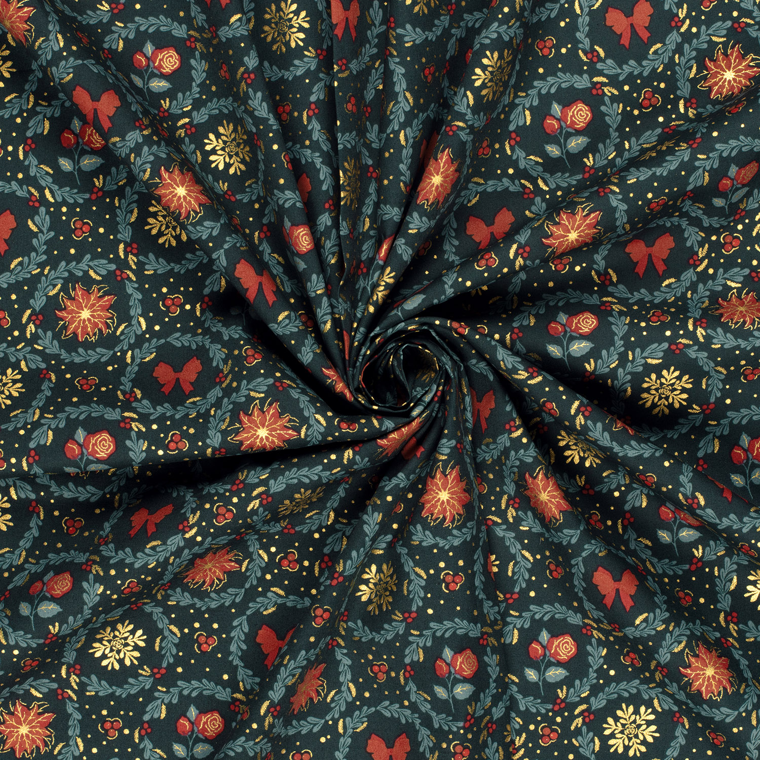 Popeline de coton – Couronne de fleurs vert sapin et or