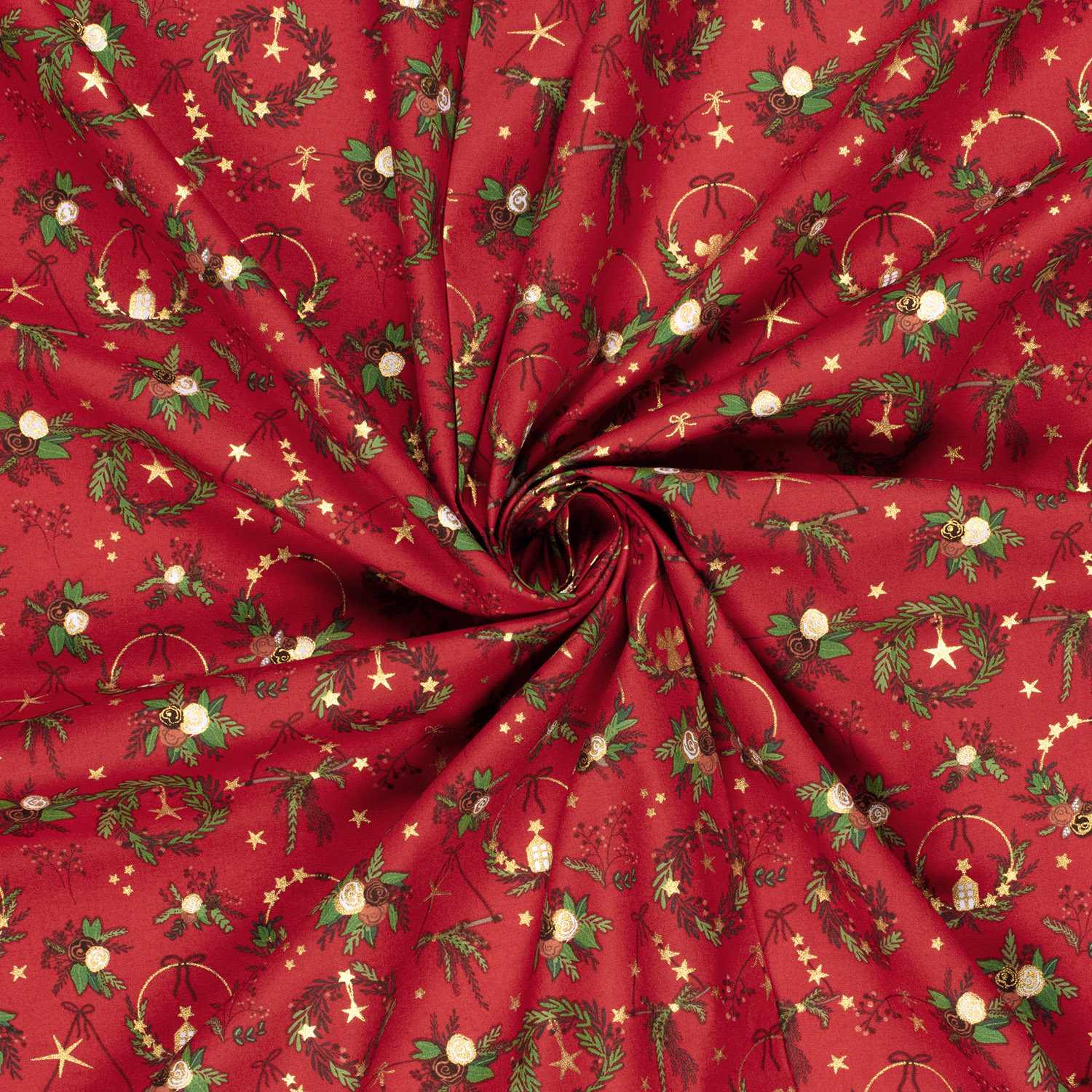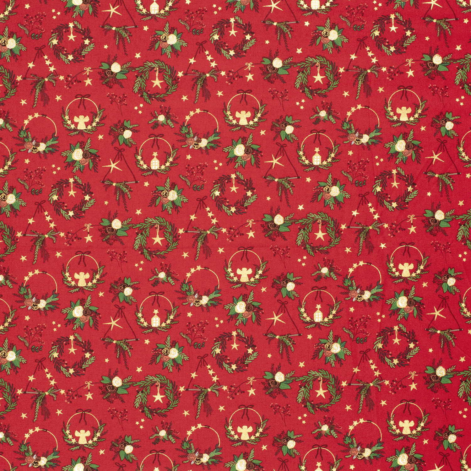 Ce tissu festif apporte immédiatement l'ambiance de Noël dans votre atelier de couture : sur un rouge chaud s'alignent des couronnes de Noël élégantes, finement décorées d'accents dorés, de nœuds et de petites étoiles. Les délicats détails dorés scintillent discrètement et confèrent au design une note noble, presque féerique.
