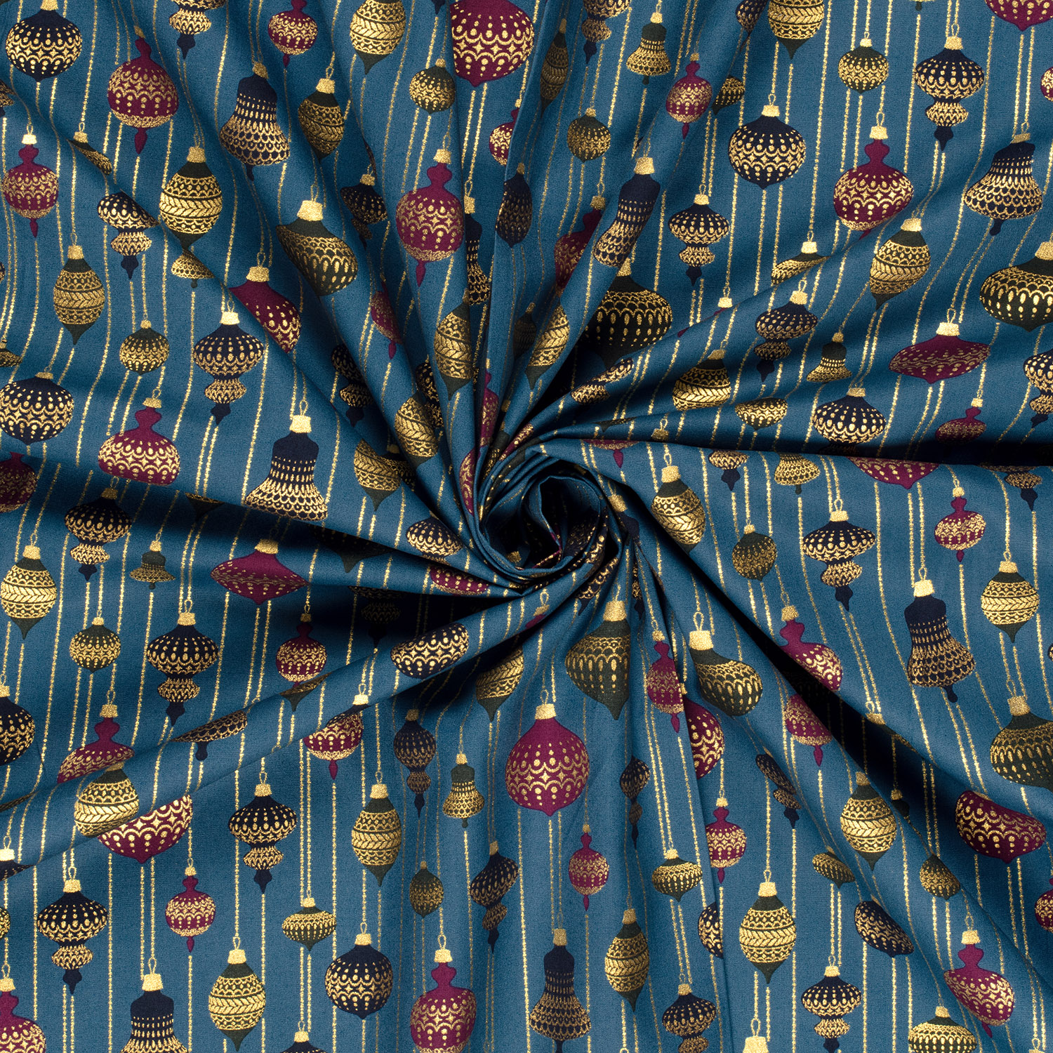 Élégance festive rencontre chic moderne : sur un bleu pétrole profond, des boules de Noël stylisées, des étoiles et des branches de sapin brillent dans une teinte dorée noble. De délicats points et fines lignes confèrent au motif une allure légère, presque flottante – comme des lumières scintillantes lors d’une nuit d’hiver claire.