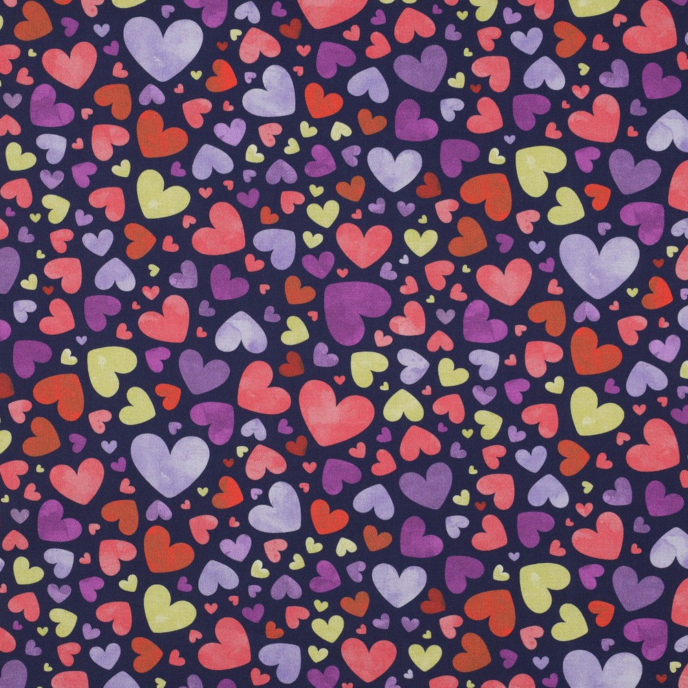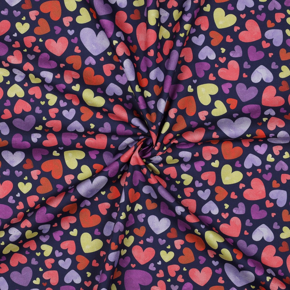 Une mer de petits cœurs sur un bleu marine profond – ce tissu enchante au premier regard. Les motifs délicats de cœurs en blanc frais et rose doux sont à la fois espiègles et élégants, et ressortent particulièrement bien sur le fond sombre.