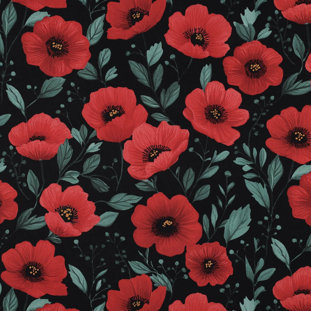 Un accroche-regard élégant : sur un fond noir profond, des coquelicots rouge vif s'épanouissent avec des nuances subtiles et des tiges délicates. Les fleurs imprimées numériquement semblent presque peintes - intenses en couleur, claires dans les détails et merveilleusement contrastées.