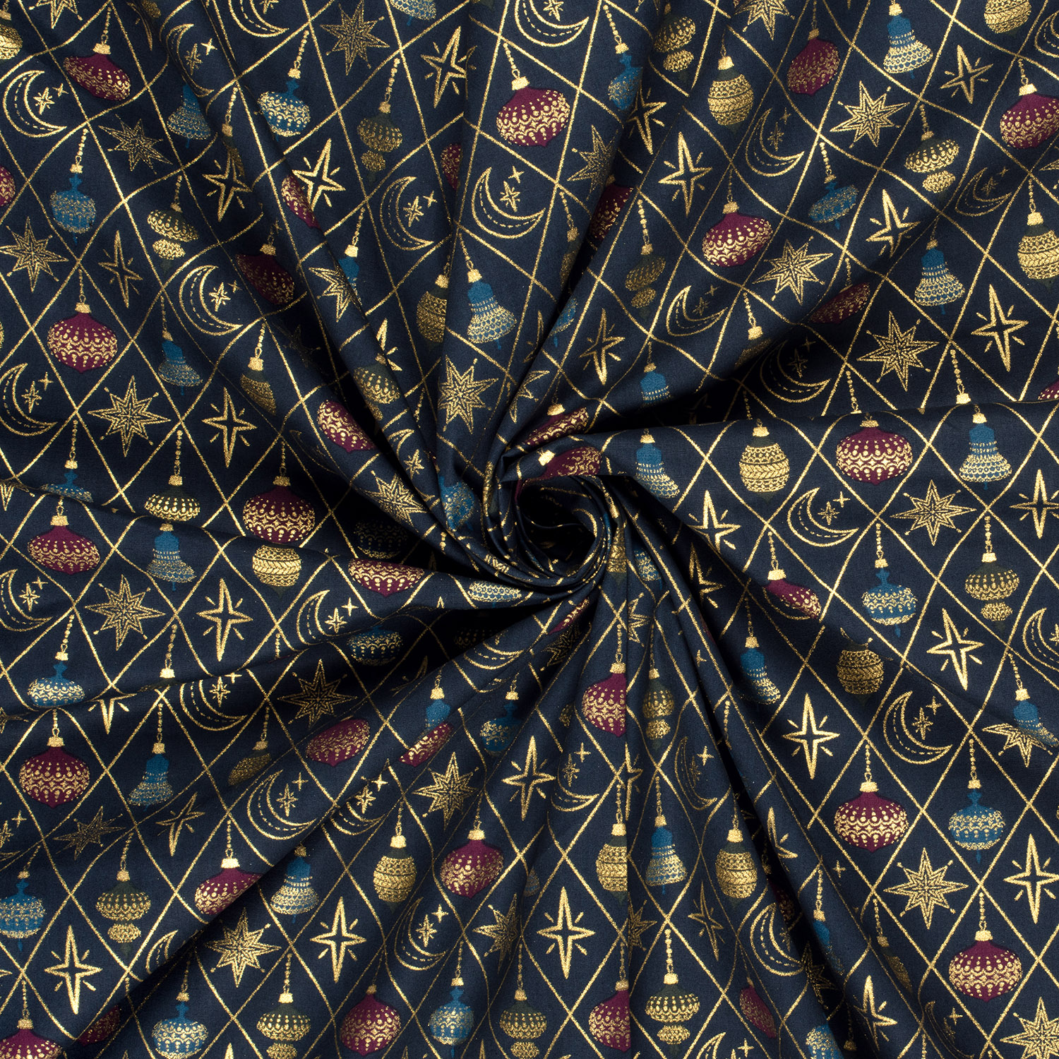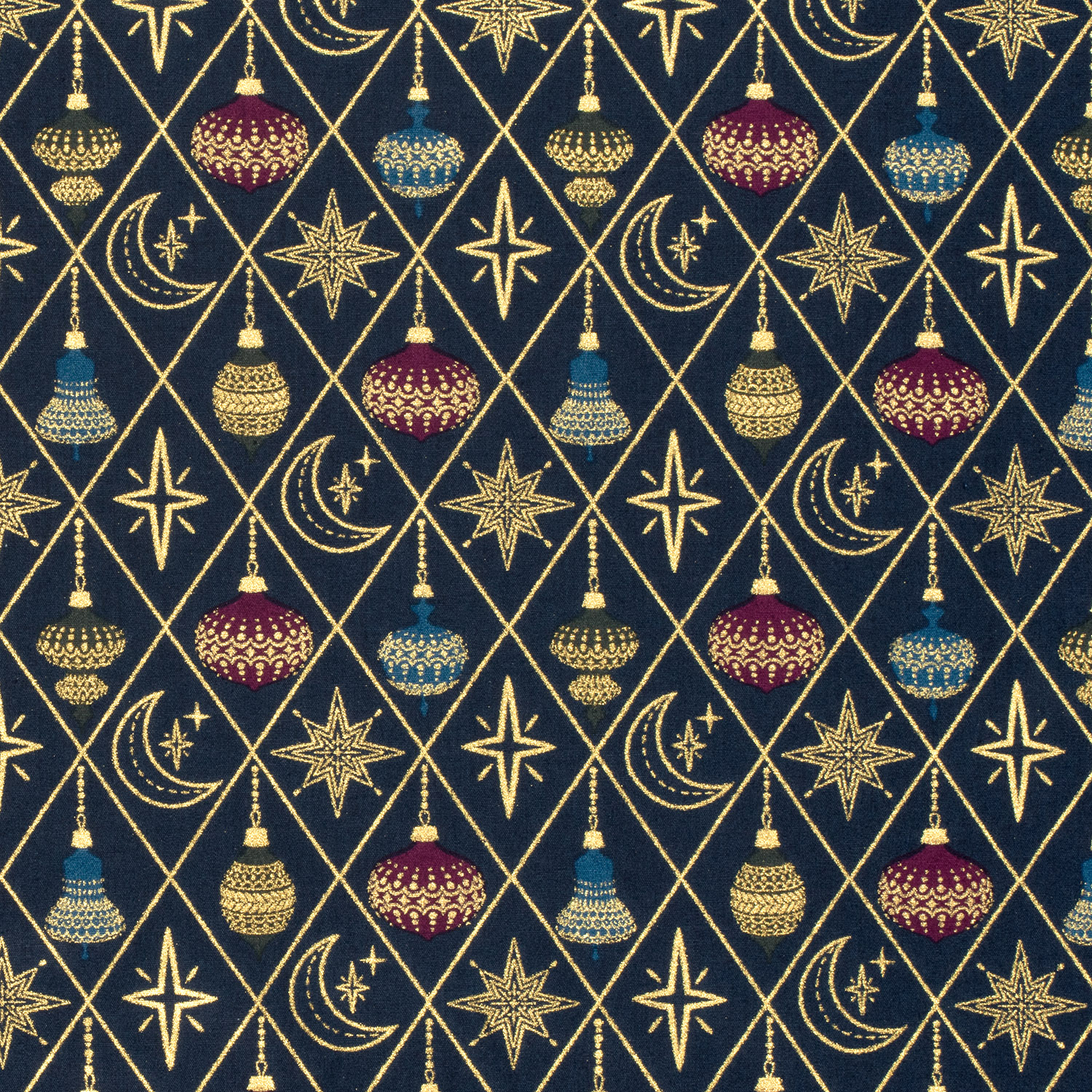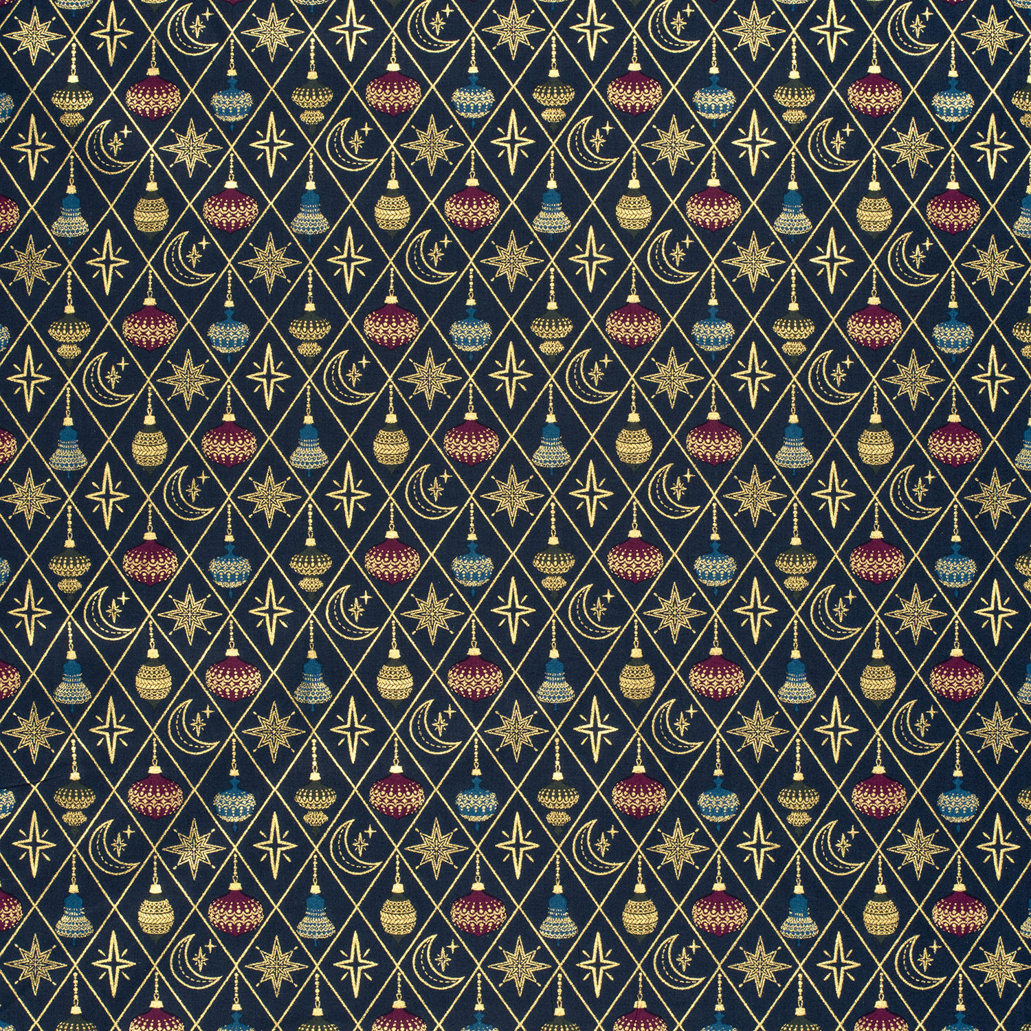 Popeline de coton - Noël Losanges Boules Marine Or