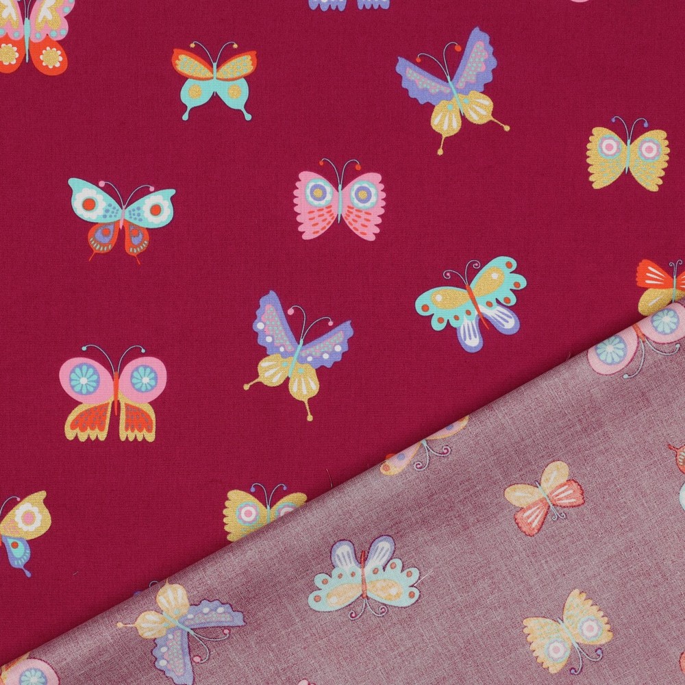 Un rêve aux tons de baies et à l'éclat scintillant : sur ce tissu, de délicats papillons dans un élégant imprimé foil dansent sur un fond riche et baies. La fine brillance du foil capte merveilleusement la lumière et fait subtilement scintiller les ailes délicates selon l'angle de vue – comme de petits bijoux sur le tissu.
