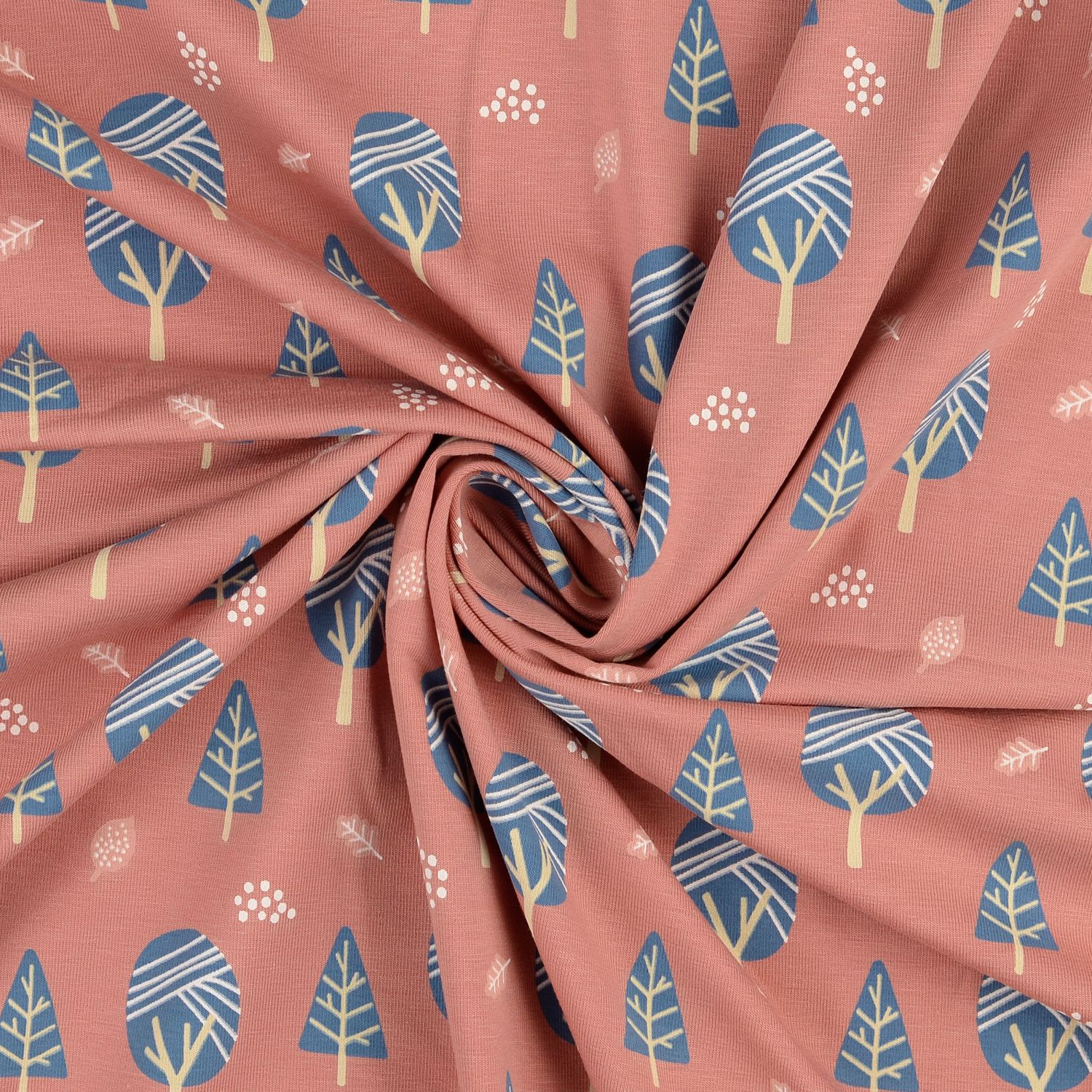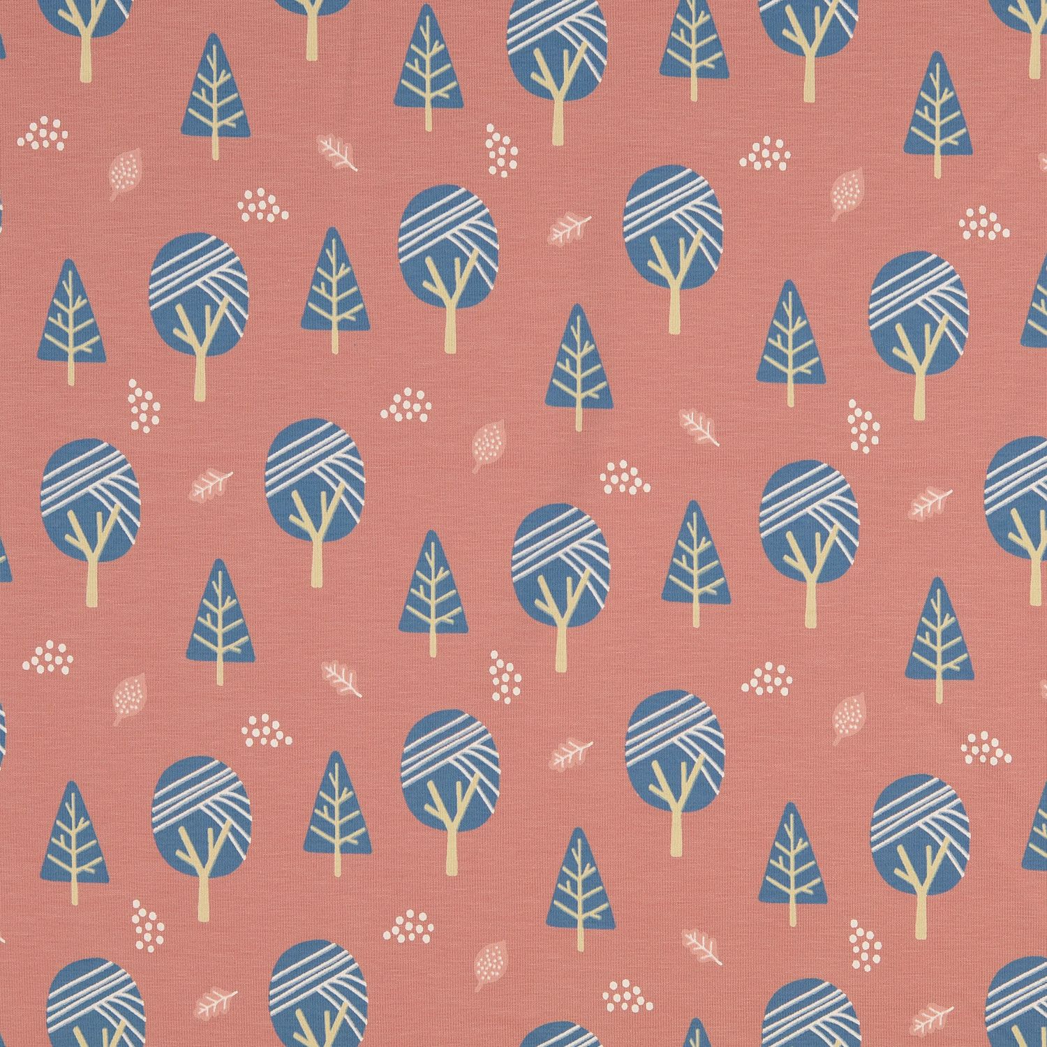 Jersey délicat dans un vieux rose chaud, parsemé de petits arbres et feuilles dessinés avec amour : des arbres feuillus et conifères fins, de petites feuilles de chêne et de fines petites taches s’éparpillent joyeusement sur le tissu, rappelant une promenade rêveuse en forêt. La palette douce composée de vieux rose, de verts sourds et d’accents clairs crée une harmonie naturelle et moderne.
