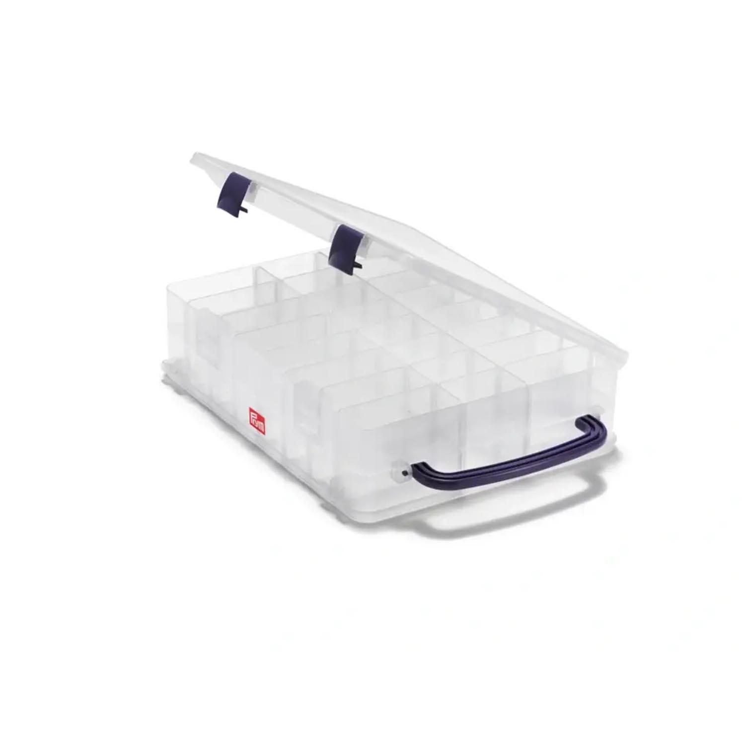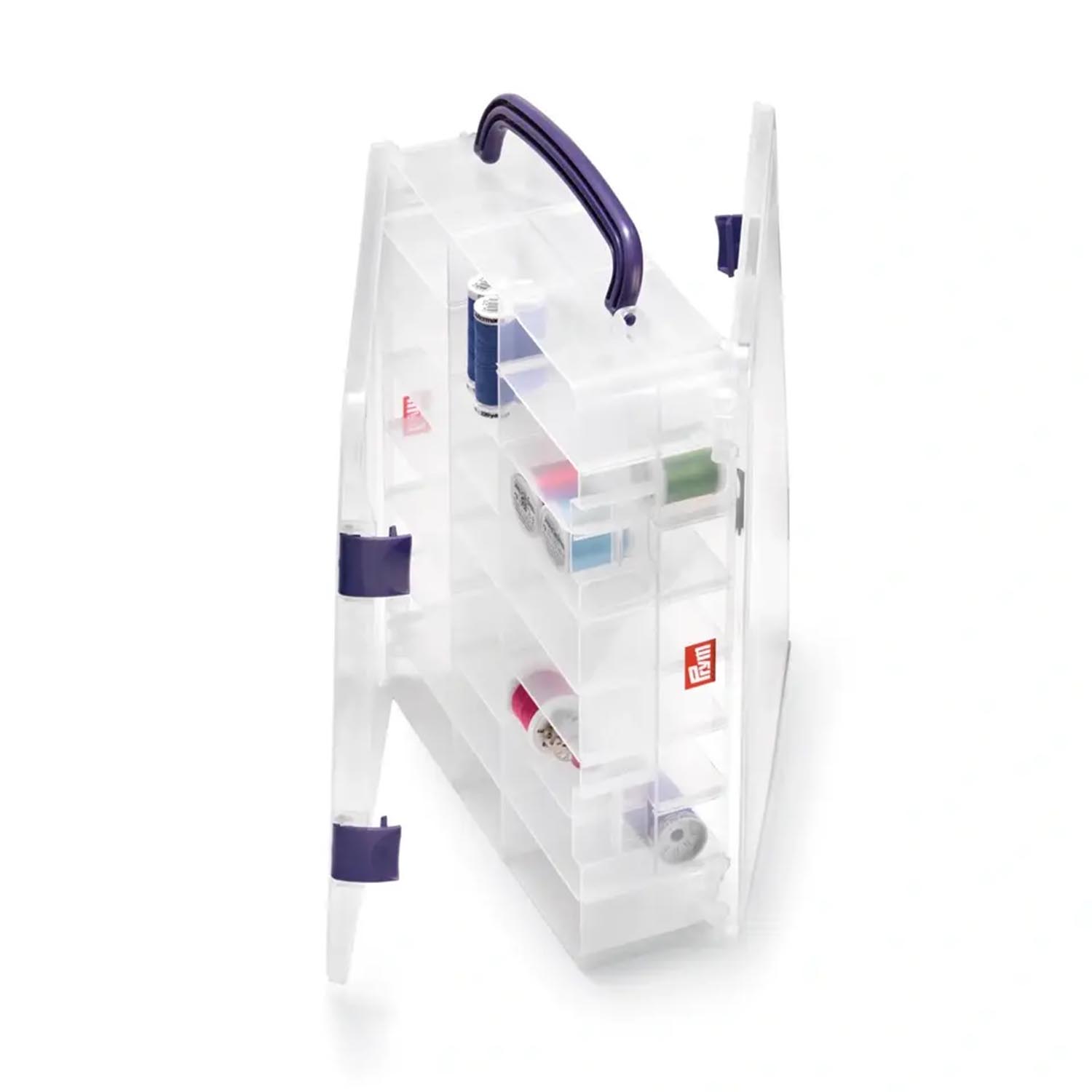 La boîte s'ouvre des deux côtés, ce qui permet d'avoir toujours à portée de main le fil dont on a besoin. La solide poignée bleu prune et les fermetures sûres en font un compagnon idéal, que ce soit dans la salle de couture, en voyage pour un cours de couture ou à la prochaine réunion créative.