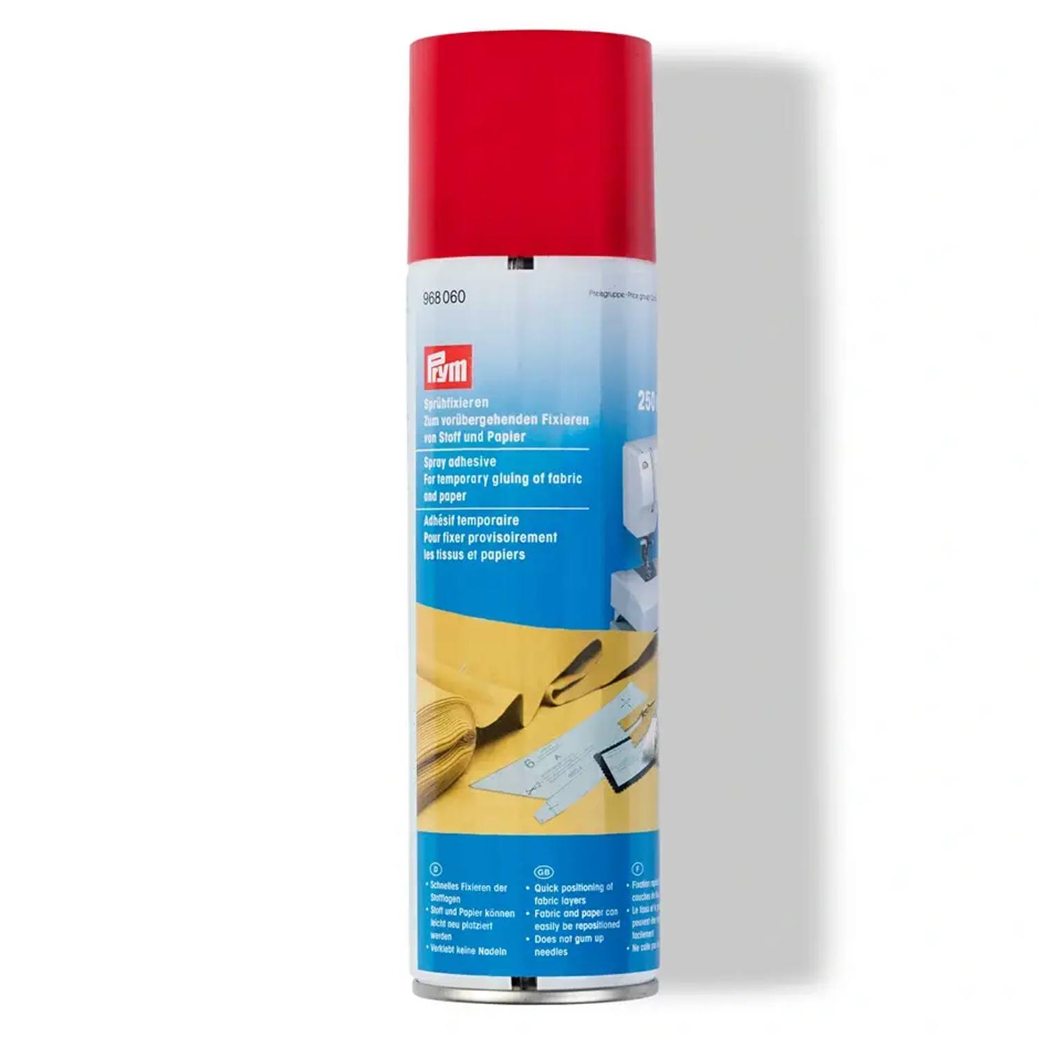 Le fixateur en spray PRYM est ton assistant invisible pour un travail précis à la machine à coudre. Le spray de fixation incolore et inodore lie les couches de tissu entre elles de manière fiable - sans aiguilles ni points de faufilage. Idéal pour fixer temporairement les couches de quilt, les applications, les broderies, les ourlets ou les pièces de patchwork.