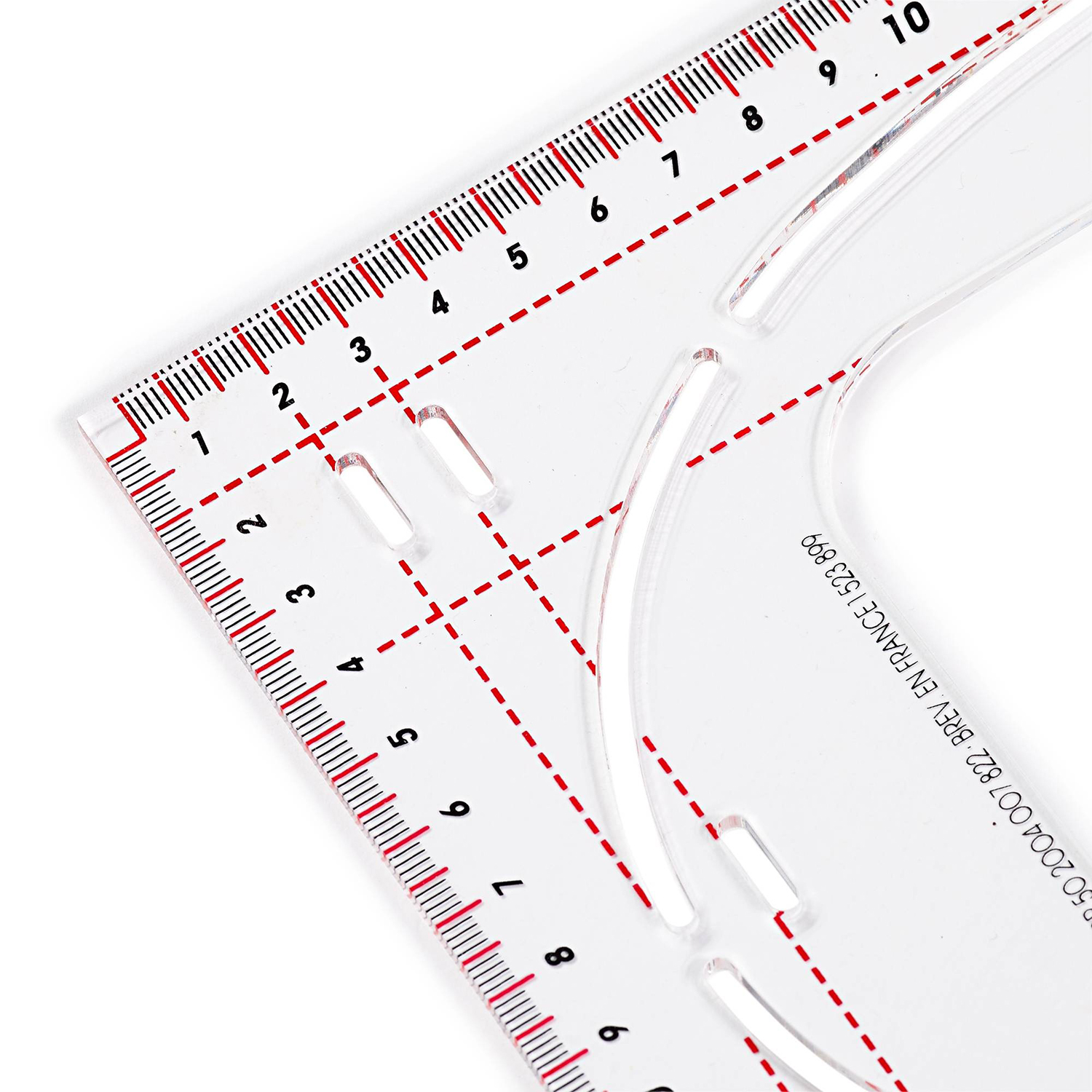 Tu traceras les ourlets, les plis et les boutonnières en un clin d'œil, sans avoir à mesurer et à retoucher. Les lignes courbes comme les boules de bras, les emmanchures ainsi que les courbes de taille et de hanches se font sans effort et de manière régulière grâce au bord extérieur élégamment bombé. Les bords droits avec deux échelles de différentes longueurs t'aident à aligner, mesurer et reporter tes marques avec précision.