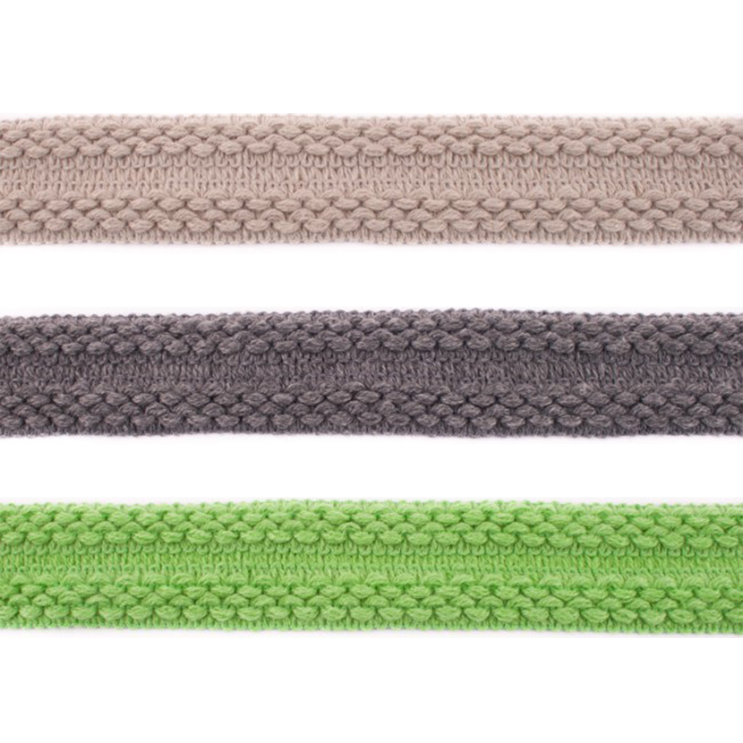 La tresse est disponible dans des couleurs harmonieuses et polyvalentes : un beige doux pour des looks naturels et tranquilles, un gris moyen élégant pour des accents intemporels et un vert pomme frais et lumineux pour attirer les regards. La structure plastique, légèrement en relief, fait que la bordure n'est pas seulement belle, mais aussi agréablement douce au toucher.