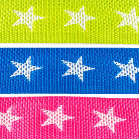 Avec cette sangle colorée en forme d'étoile, les sacs, les sacs à dos et les accessoires attirent immédiatement l'attention. Les étoiles blanches clairement tissées se détachent brillamment du fond et ressortent particulièrement bien sur le vert citron frais, le bleu royal vif et le rose riche.