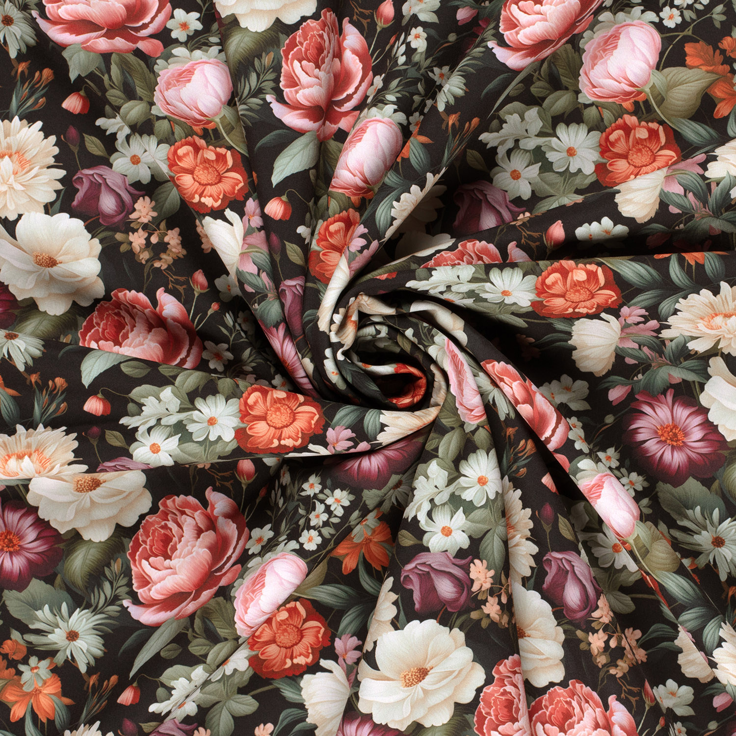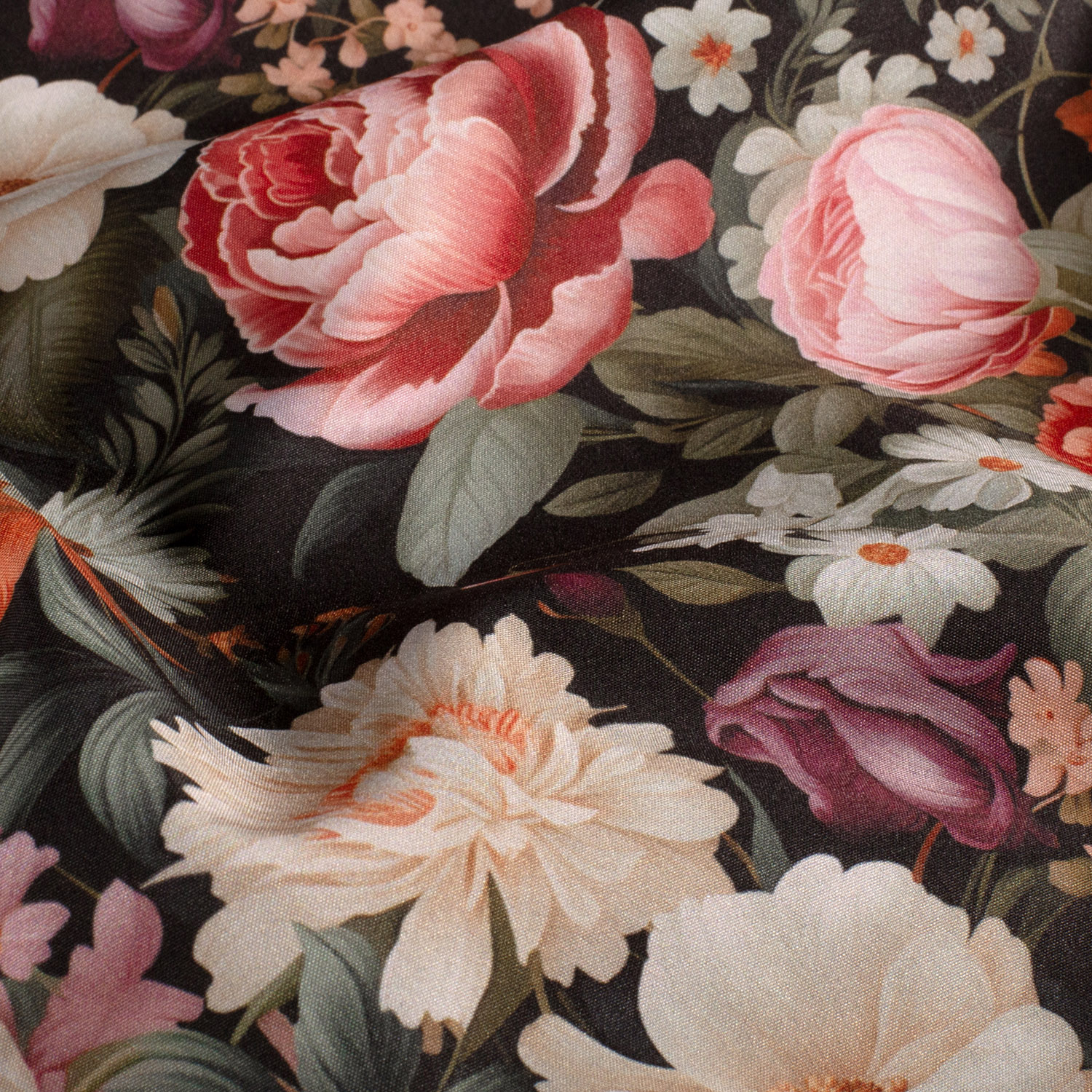 Un tissu comme une nuit mystérieuse au milieu d'une mer de fleurs : sur un fond noir profond, des fleurs imprimées avec précision dans des tons délicats de rose, crème et beige, accentuées par de fines feuilles et des boutons. Le motif floral est à la fois élégant et moderne – parfait pour ceux qui souhaitent associer la simplicité de l'obscurité à une touche de romantisme.