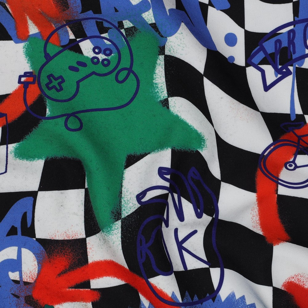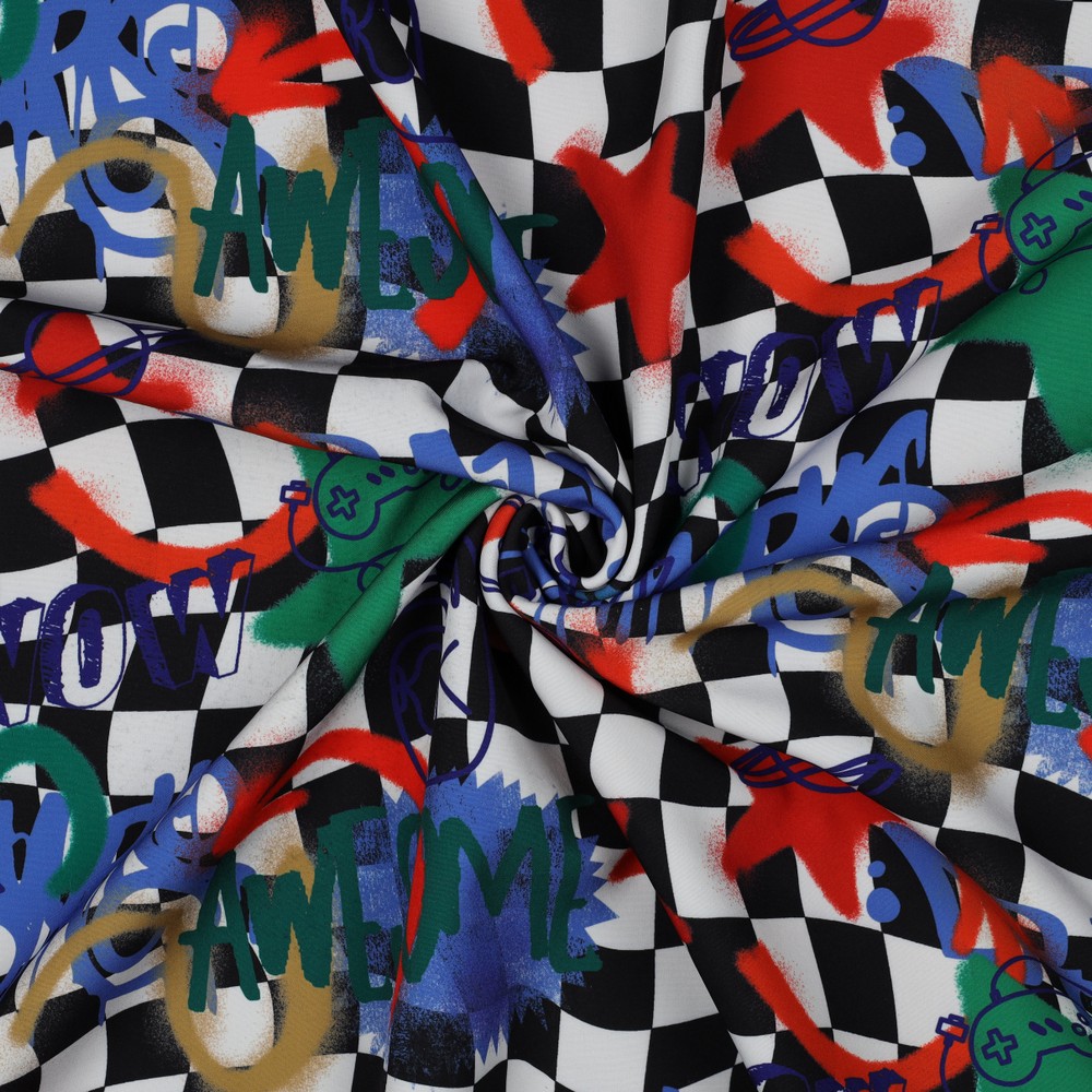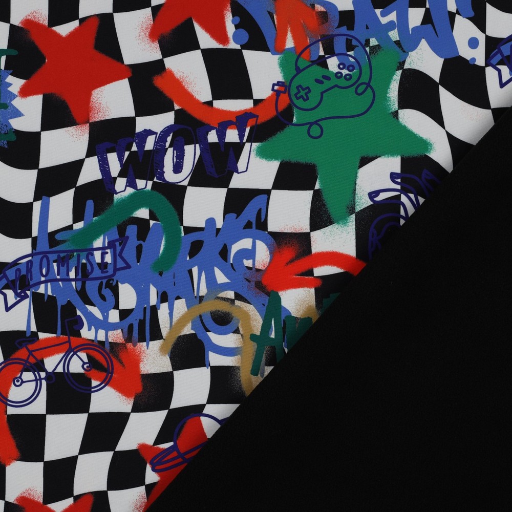 Ce softshell apporte une véritable ambiance street art à vos projets de couture ! Des éléments de graffiti colorés aux teintes vives comme le rose, le bleu, le jaune, le vert et l’orange rencontrent des inscriptions stylées, des étoiles et des formes dynamiques – comme un mur couvert de tags créatifs et de sprays.