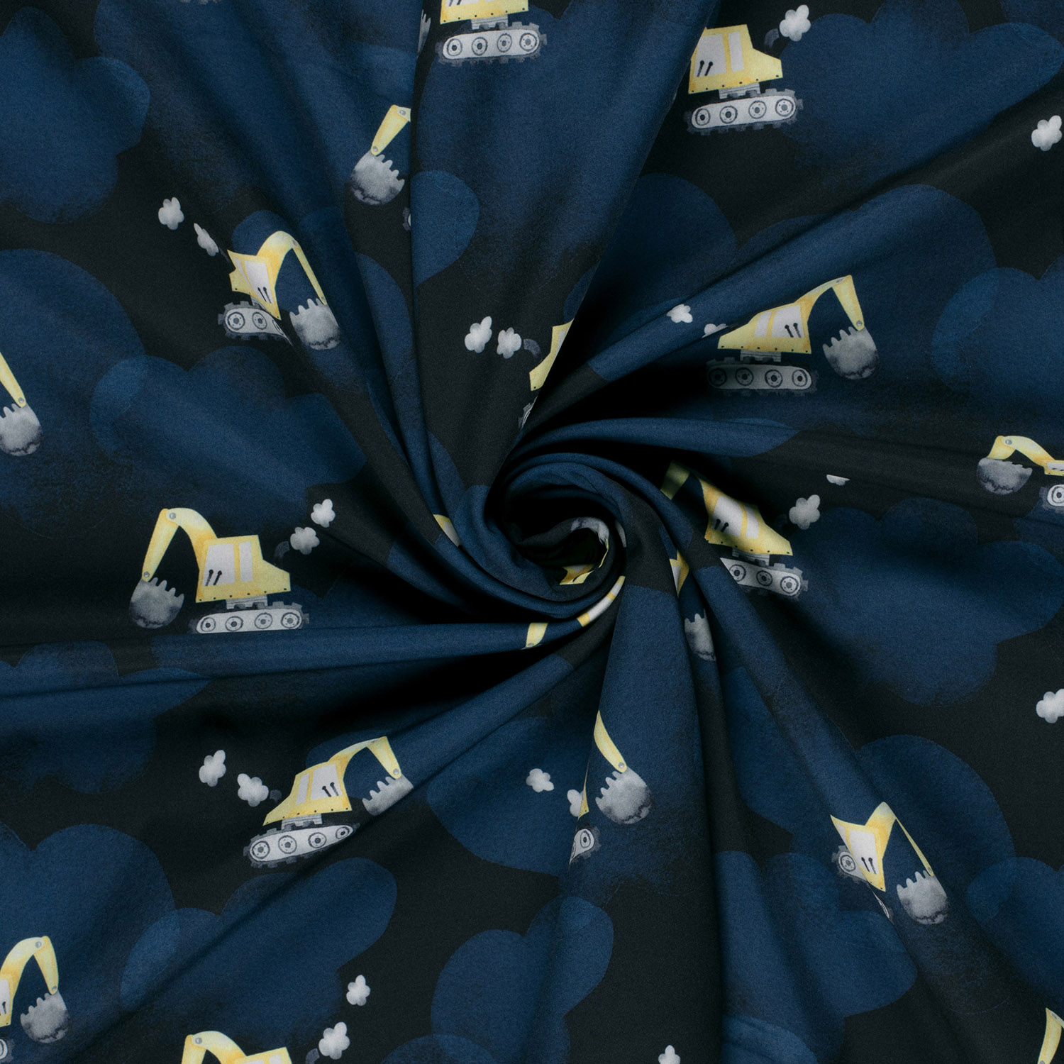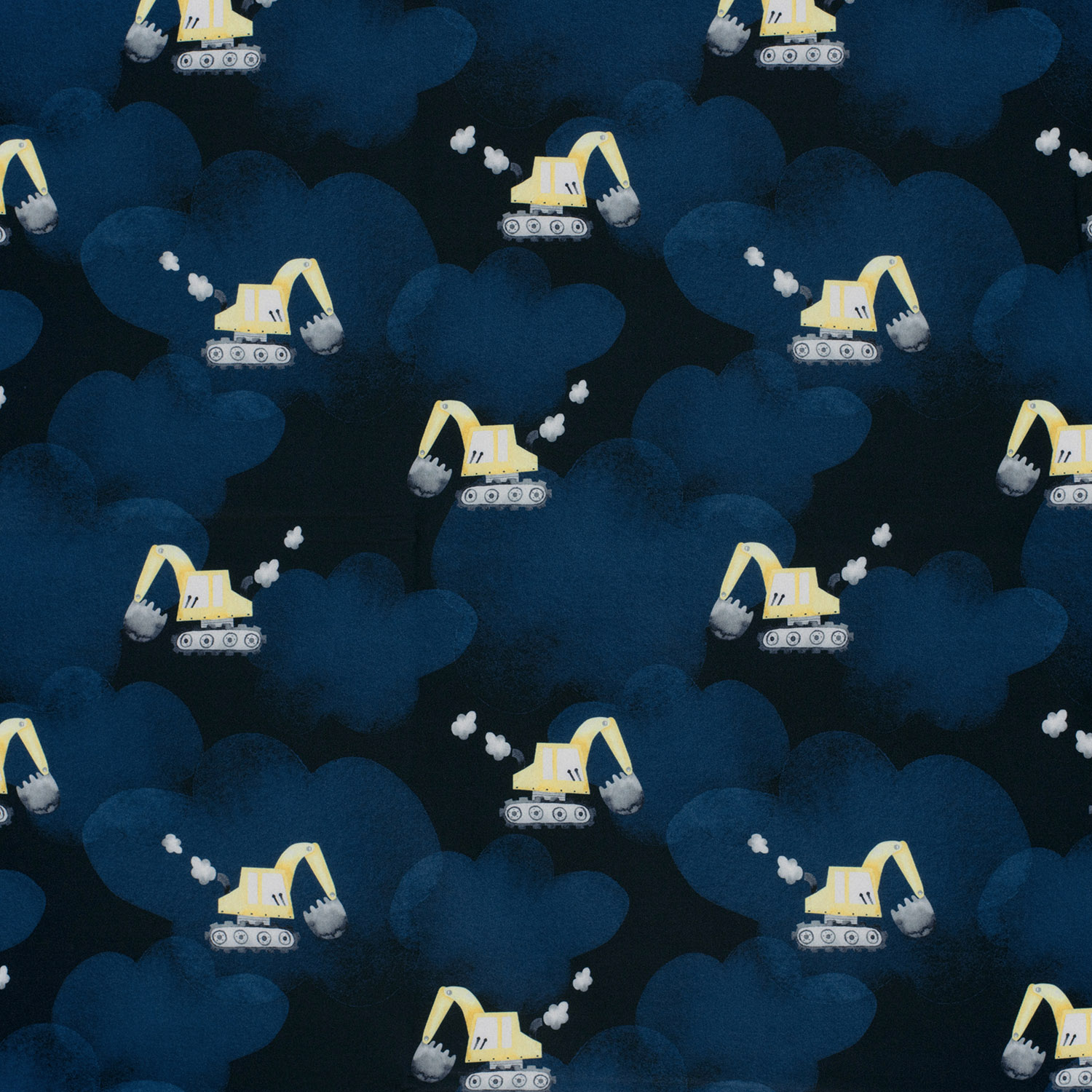 Le tissu est parfait pour les vestes, combinaisons, pantalons imperméables, gilets ou accessoires d'extérieur que les enfants aiment porter fièrement. Les couleurs vives et le design clair ressortent particulièrement bien sur de grandes surfaces – idéal pour des pièces favorites remarquables qui accompagnent toutes les aventures en plein air. Un vrai coup d'œil pour tous ceux qui aiment les pelleteuses et compagnie !