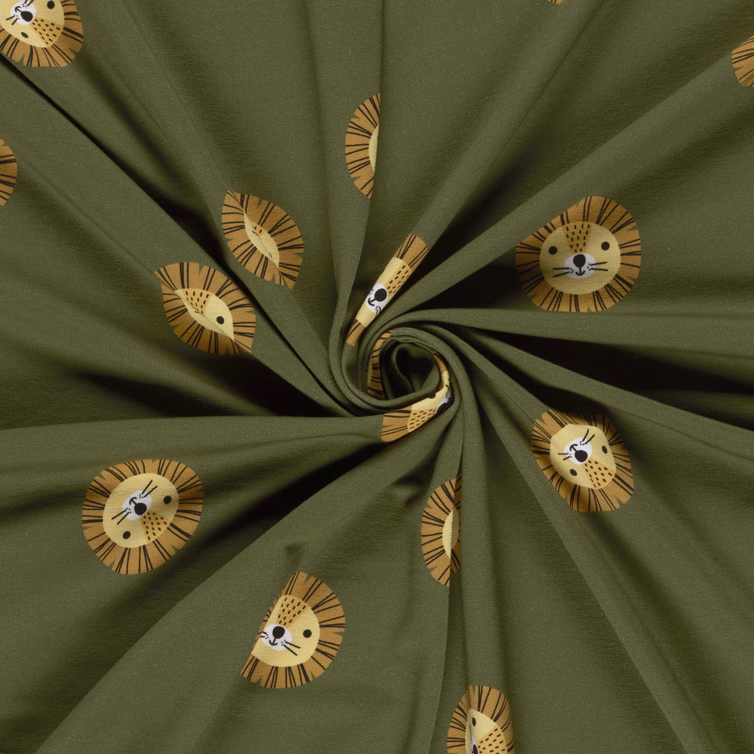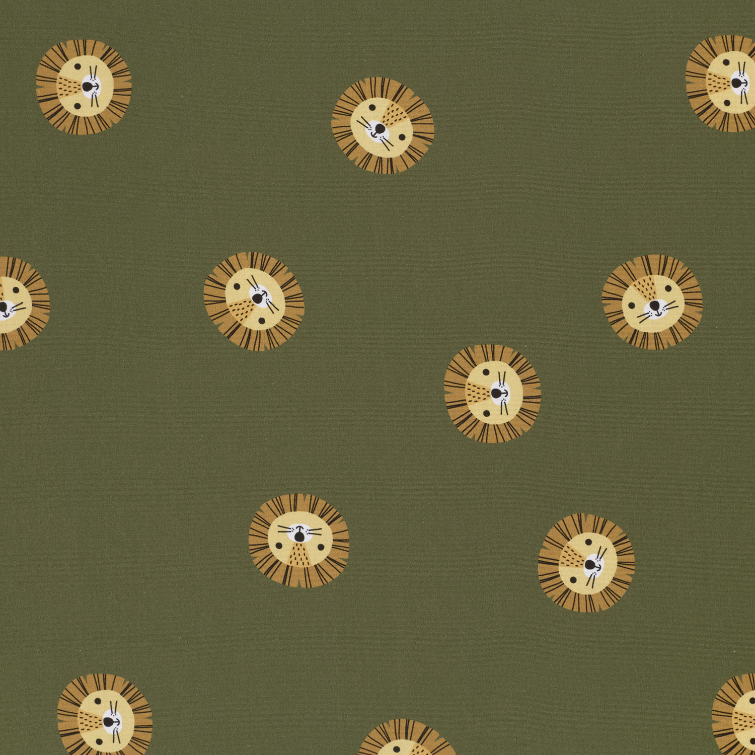 Un tissu plein de caractère : sur un fond kaki doux, des visages de lion stylisés dans des tons chauds et naturels évoluent. Des lignes fines, des ombres douces et des contrastes discrets donnent aux lions un look moderne, légèrement ludique – ni trop enfantin ni trop sauvage, parfait pour petits et grands.