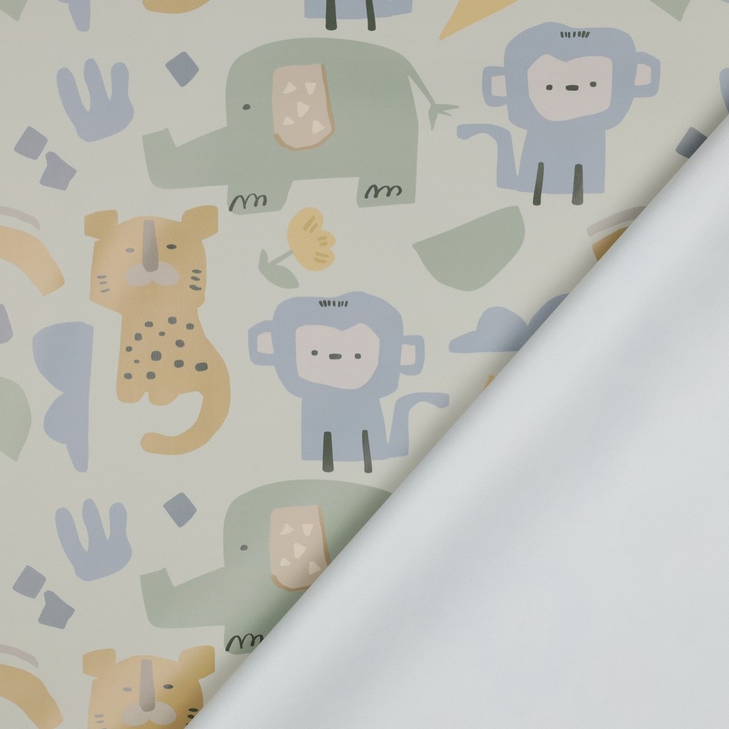 Avec ce tissu imperméable joyeux, quel que soit le temps, c’est la fête ! Sur un fond clair crème ecru, s’animent des animaux de safari illustrés avec soin – lions, girafes, zèbres et éléphants dans des tons naturels doux et des accents délicats. Le design ludique est à la fois moderne et adapté aux enfants, et attire immédiatement l’attention.