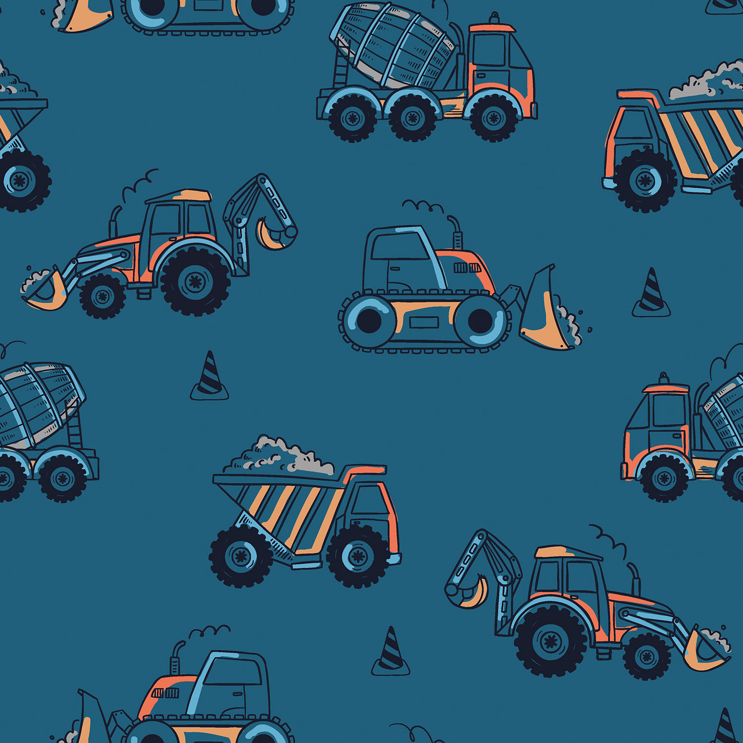 Ce tissu pour veste imperméable est fait pour les petits fans de chantier : sur un fond bleu indigo profond, des pelleteuses, bennes basculantes et engins de chantier colorés circulent sur le tissu – dessinés avec précision, dans des tons jaunes, orange et rouges éclatants qui attirent immédiatement le regard.