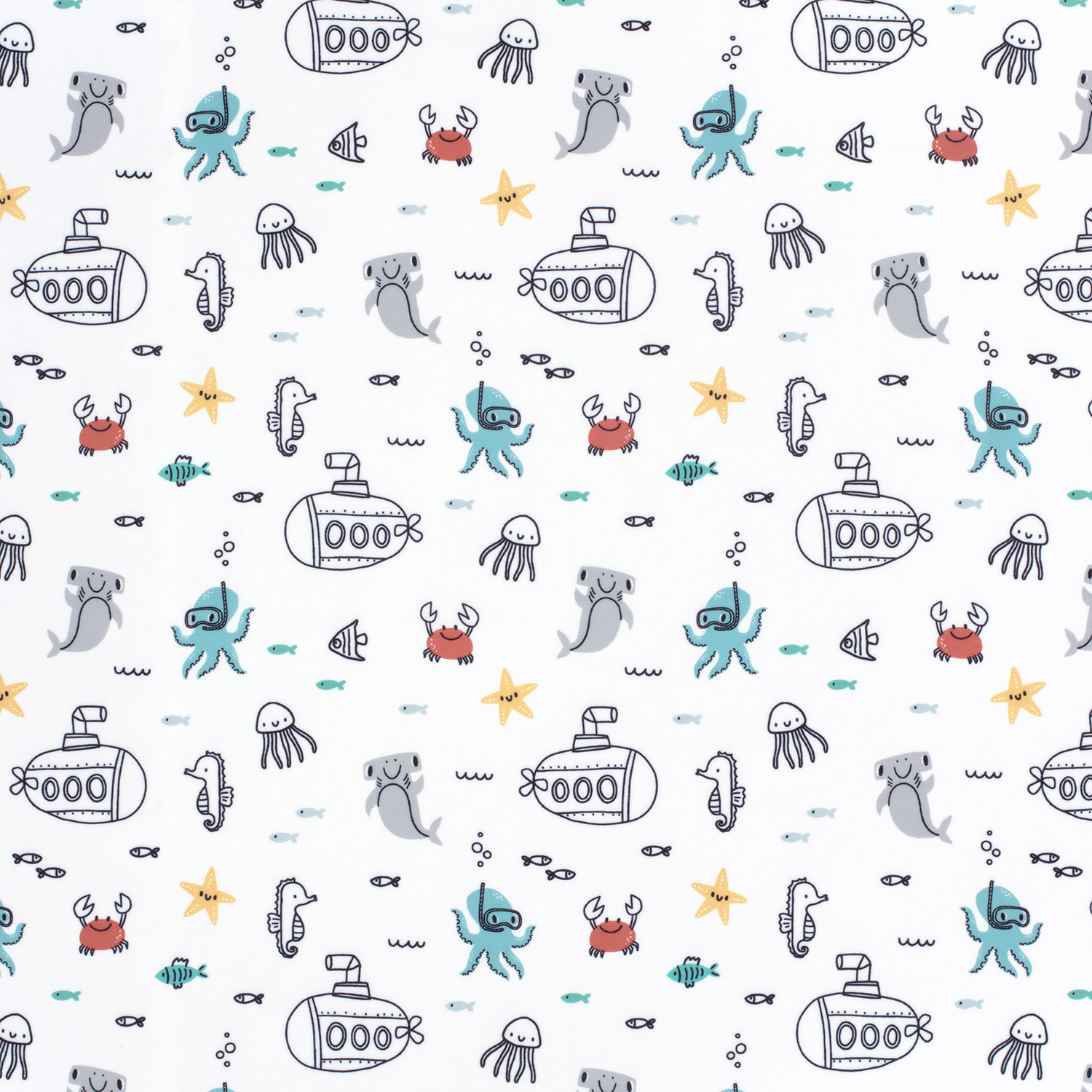 Ce tissu sport et maillot de bain apporte la mer directement à votre machine à coudre : Sur un fond blanc éclatant, des animaux marins finement dessinés s’animent – des poissons élégants aux étoiles de mer en passant par des coraux délicats. Les lignes fines et l’impression numérique moderne rendent le motif sous-marin particulièrement clair et de haute qualité, sans être trop coloré ni enfantin. Il en résulte un look frais et marin, à la fois élégant et intemporel.