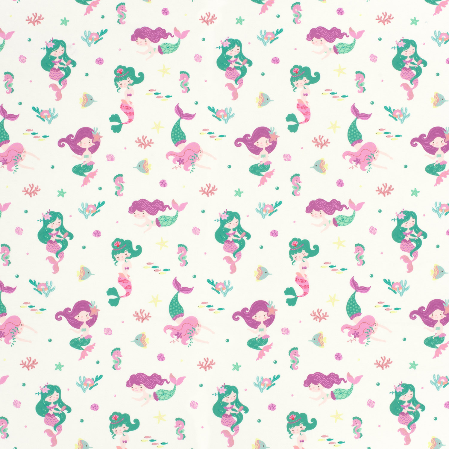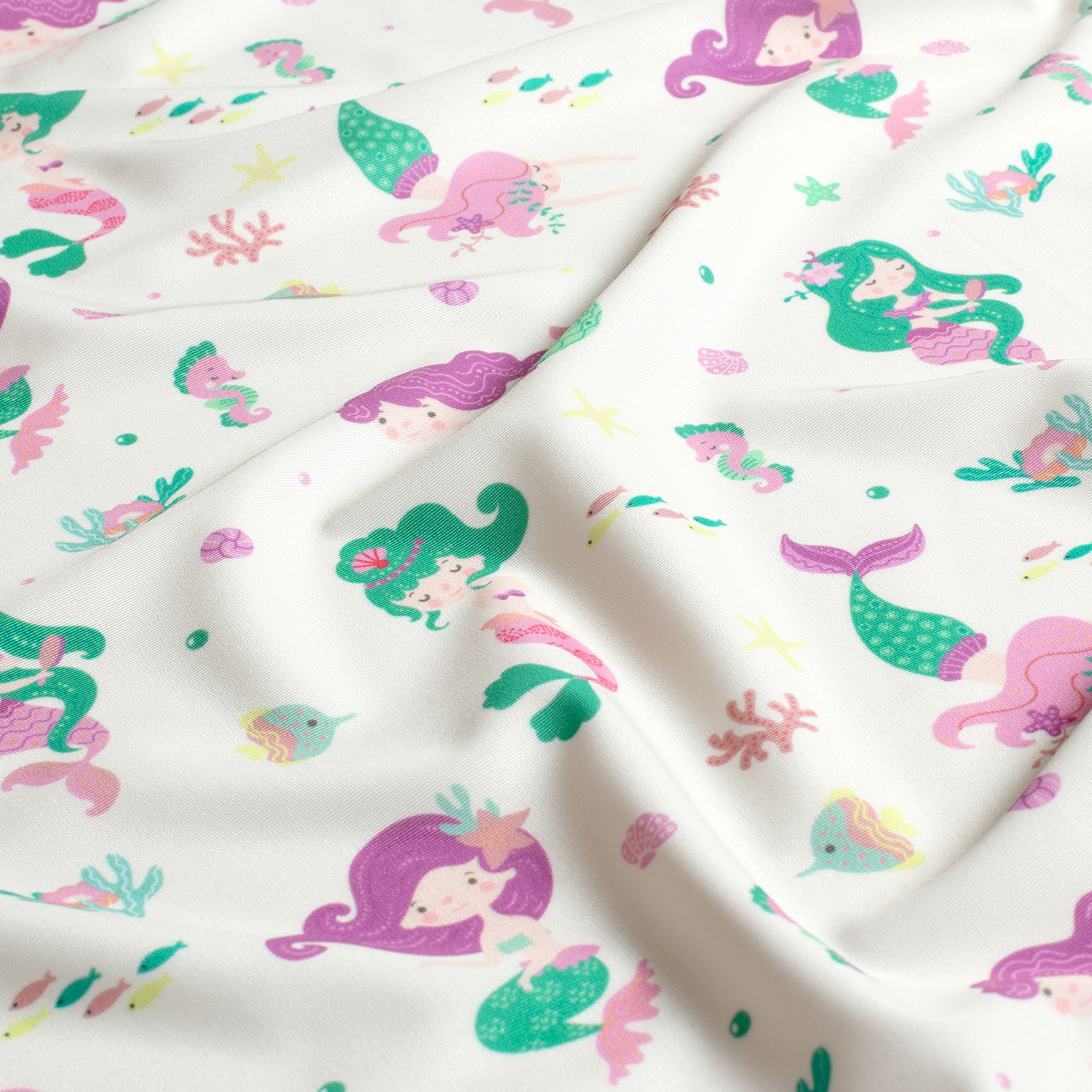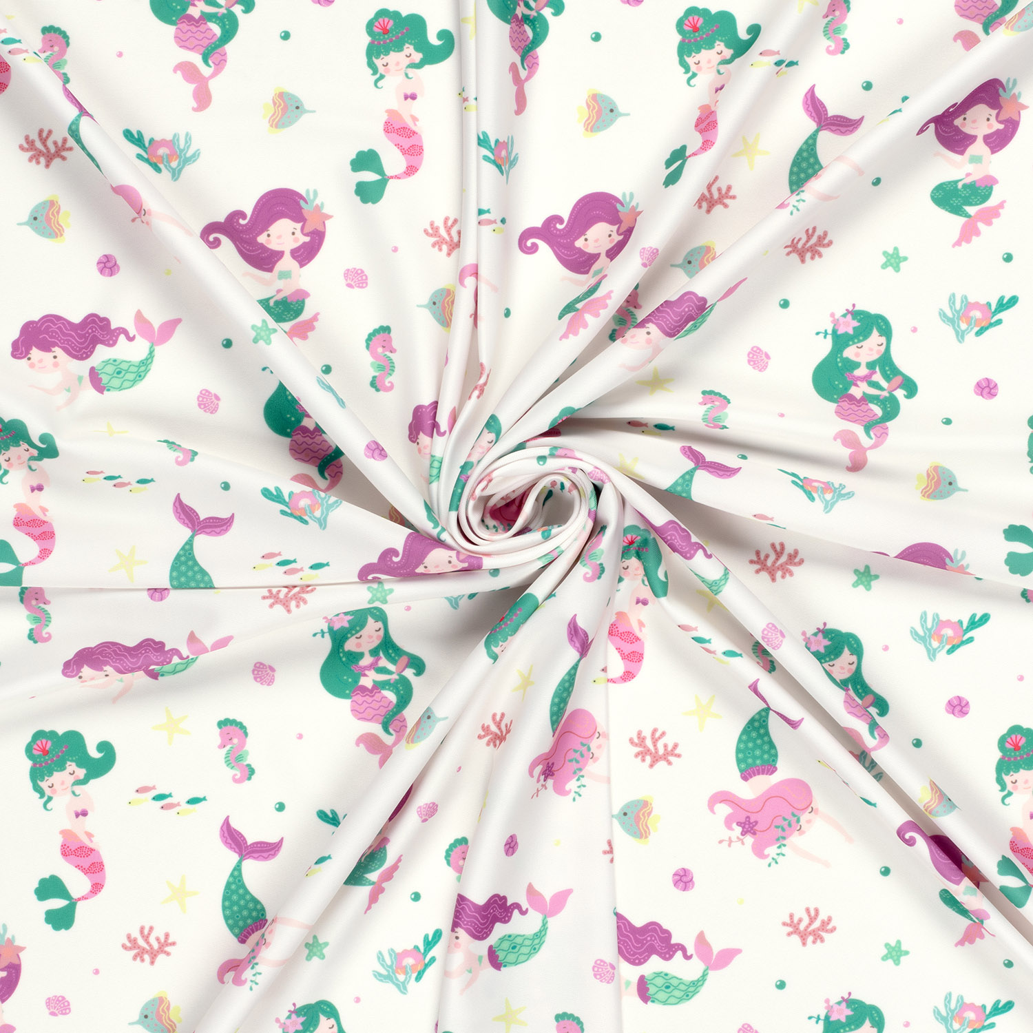 Ce tissu sport & maillot de bain enchante avec un design de sirène dans des tons délicats de rose et de pastel. De fines sirènes aux cheveux flottants, des plantes marines ludiques et de délicats détails sous-marins semblent peints et évoquent immédiatement l'été, la plage et le bruit des vagues. Le doux dégradé de rose, violet, menthe et tons aqua clairs offre un look doux et féerique – parfait pour les petites et grandes naïades.