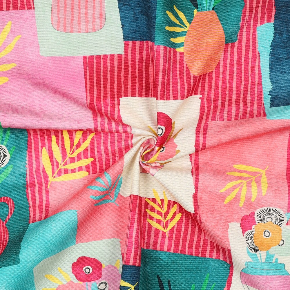 L'univers des couleurs est à la fois vivant et harmonieux : un rose éclatant forme la scène pour des motifs floraux abstraits dans des tons chauds de jaune, d'orange et de rouge, accentués par des tons froids de bleu et de vert. Des contours fins et des blocs de couleur en surface donnent au motif un caractère artistique, presque illustratif - comme de petites impressions design qui s'étendent sur tout le tissu.