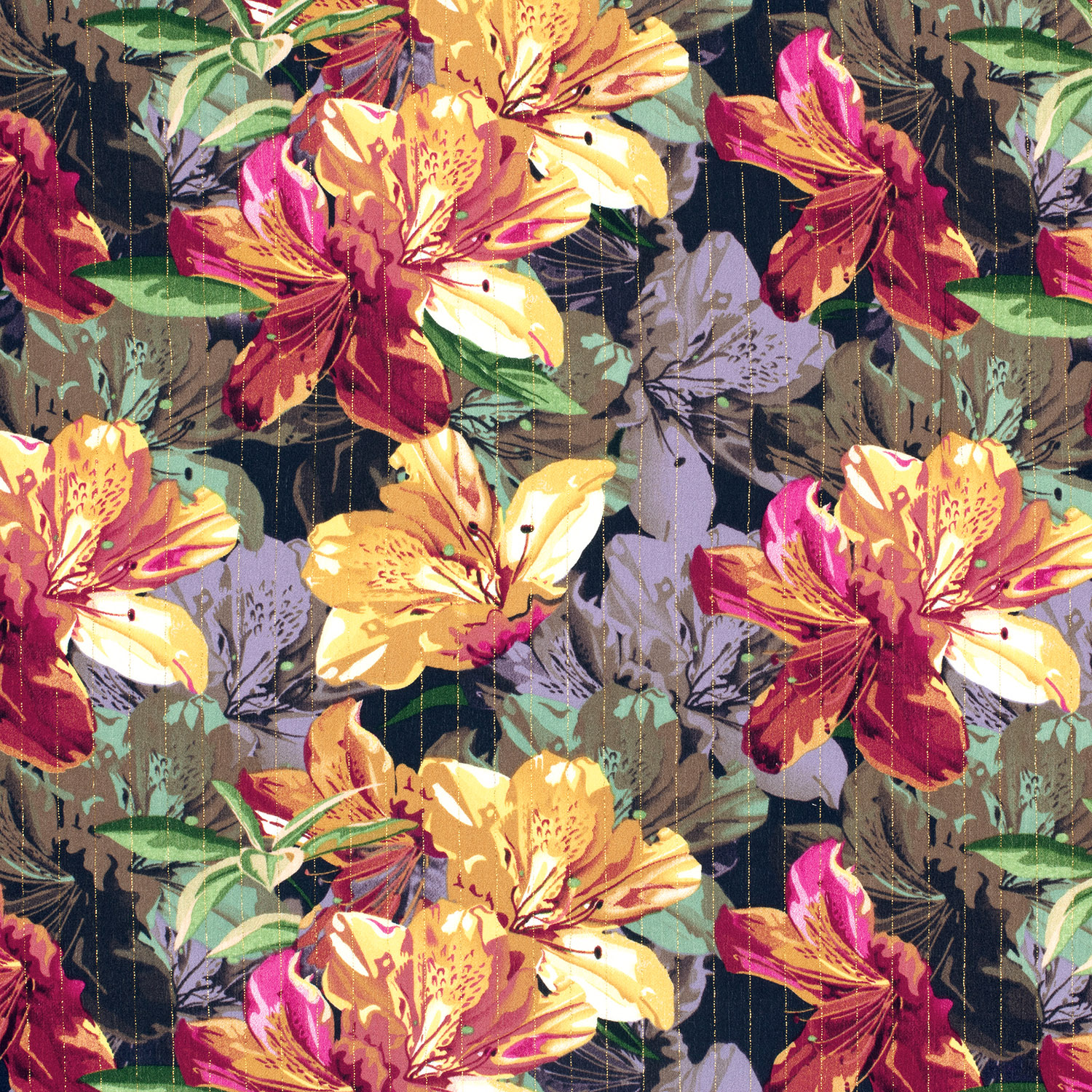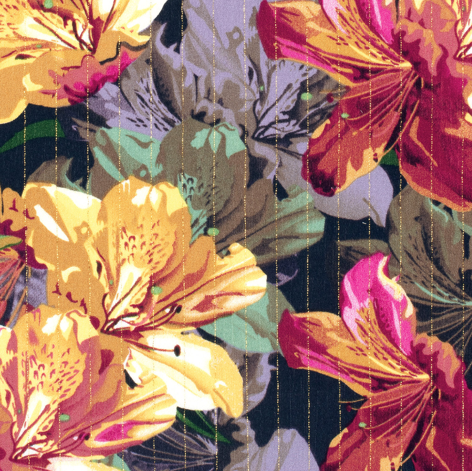 Un souffle de ciel du soir sur le tissu : sur un fond bleu marine profond éclosent des lys élégants, délicatement dessinés et finement répartis sur toute la surface. Entre les motifs floraux, de fines fils de Lurex scintillent comme de petits reflets lumineux, conférant au design une note noble et légèrement glamour.
